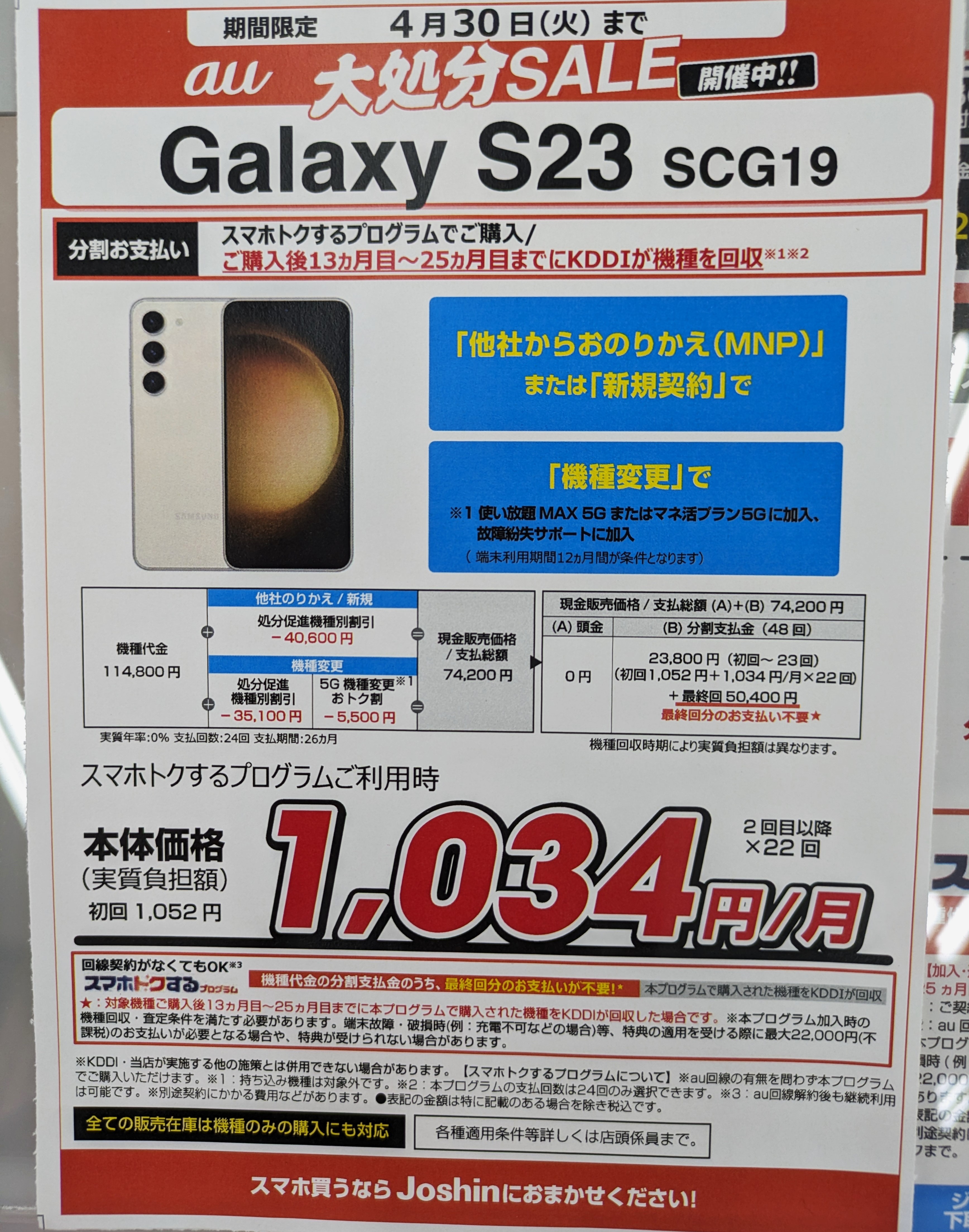 ジョーシンでは2023年4月発売の、au「Galaxy S23 SCG19(税込114,800円)」が、新規・MNPで40,600円割引となり、総額74,200円(税込)となっています。