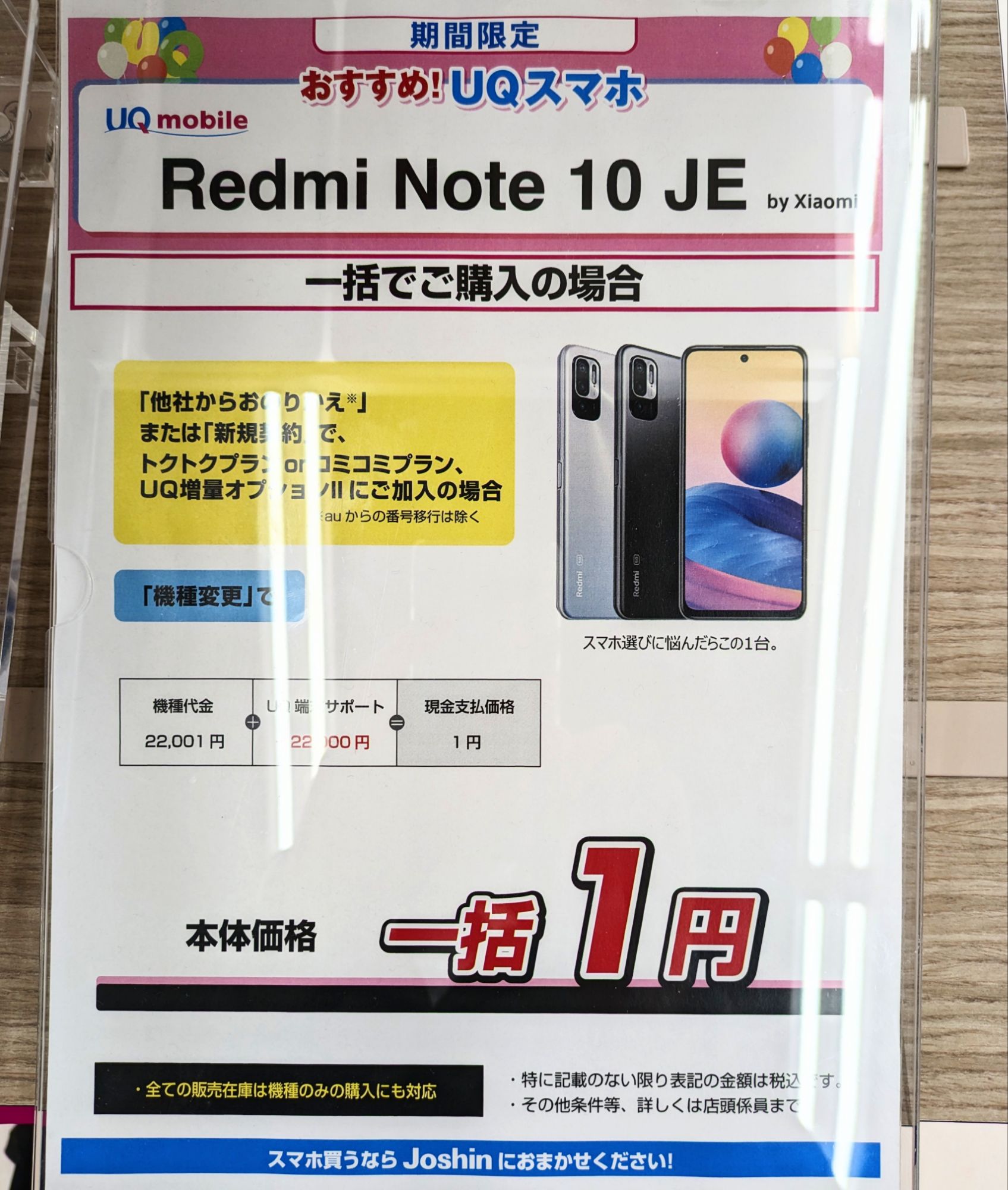 ジョーシンでは、2021年9月発売のUQモバイル「Redmi Note 10 JE (税込22,001円)」が、機種変更一括1円となっています。事務手数料は3,850円(税込)。