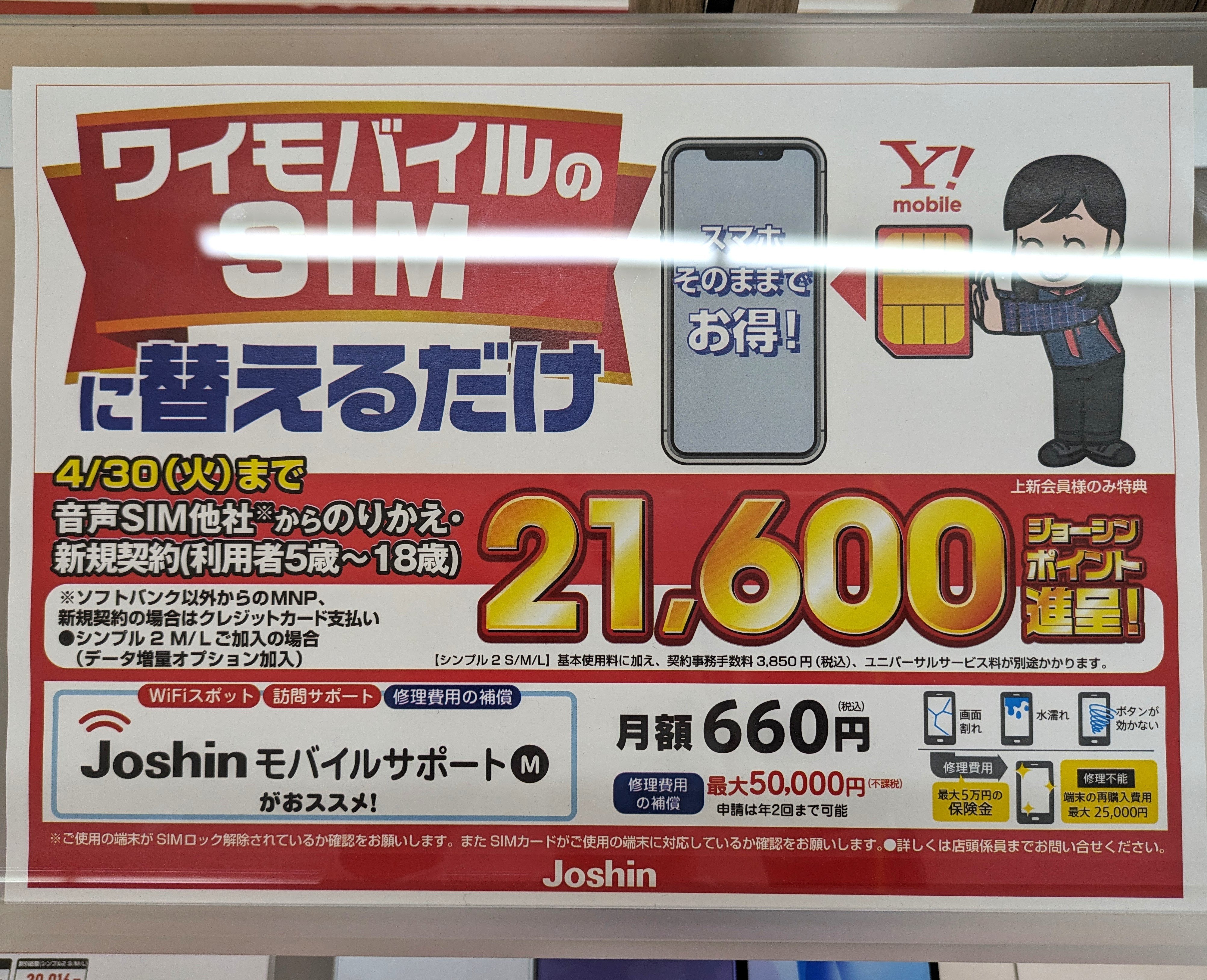 ジョーシンではワイモバイルのSIMのみ純新規(18歳以下)・MNP契約で21,600ポイント還元となっています。