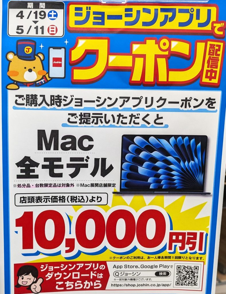 【5/11(日)まで)】最新M4「MacBook Air」が1万円OFF/ジョーシン 2025 5/04 Apple製品 2025年5月4日 当ページにはアフィリエイト広告が含まれています。 ジョーシンでは「Mac」全モデルが10,000円OFFとなっています。5/11(日)まで。 2025年3月発売の「MacBook Air 13.6インチ(税込164,800円)」なら1万円OFFで154,800円(税込)です。 MacBook Air M4(amazon.co.jp) Apple製品 よかったらシェアしてね! URLをコピーしました! URLをコピーしました! この記事を書いた人 Sakura R5G ケータイ特価情報をお届けします。 遠慮なくコメント頂ければ結構ですが、コメントは私が承認するまで表示されませんので、ご注意下さい。 ※2024年7月1日より、参考程度の投稿以外はX(旧ツイッター)に投稿しようと思っています。 人気記事 ワイモバイル 【8/14(木)より】価格(再)更新、ワイモバイル「Google Pixel 8a」が機種変更で49,536円にPayPay還元/事務手数料0円/ヤフーショッピング店 2025年8月14日 ワイモバイル 【2025/11版】ワイモバイル「iPhone 13(認定中古品)」が機種変更一括29,520円/事務手数料3,850円/オンラインストア 2025年11月9日 楽天モバイル 【2025/12版】楽天モバイル「nubia S2R」や「Galaxy A25 5G」がMNP一括1円/事務手数料0円 2025年12月2日 ドコモ 【2025/8版】ahamoへのSIMのみMNPで20,000dポイント(分割進呈)/事務手数料0円/NTTドコモ 2025年8月10日 楽天モバイル 【7/1(火)より】楽天モバイルへのMNPで▲22,000円割引/「Nothing Phone (3a)」が一括32,890円など/事務手数料0円 2025年7月1日 新着記事 【1/10(土)】 Joshin webで「Xiaomi 14T Pro 512GB(パッケージ不良)」が79,800円 【1/15(木)発売】楽天モバイル「Nothing Phone (3a) Lite」が32,890円/はじめて申し込み&MNPで16,000ポイント/2回線目以降は新規で6,000ポイント 【1/13(火)まで】UQモバイル「自宅セット割」適用で10,000ポイント追加還元/ビックカメラ コメント コメントする コメントをキャンセルコメント ※ 名前 メール サイト 新しいコメントをメールで通知 新しい投稿をメールで受け取る