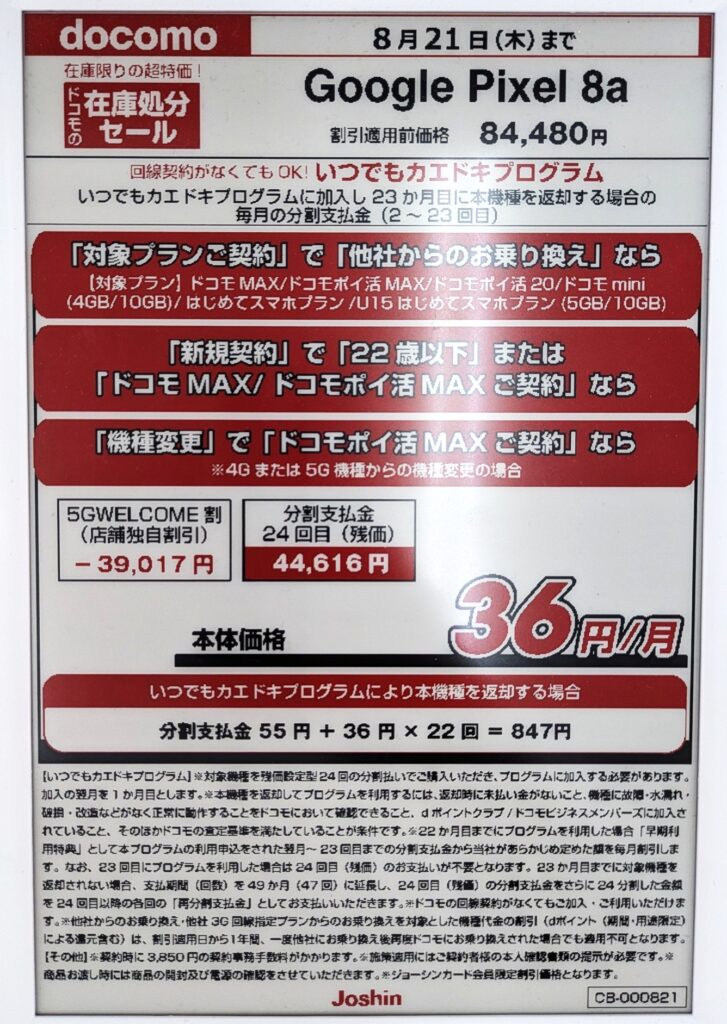 ジョーシンでは、2024年5月発売のドコモ「Google Pixel 8a(税込84,480円)」が、機種変更で▲39,017円割引になり、総額45,463円(税込)となっています。事務手数料は3,850円(税込)、8/21(木)まで。