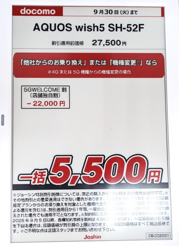 2025年6月発売のドコモ「AQUOS wish5(税込27,500円)」は機種変更で一括5,500円(税込)。9/30(火)まで。