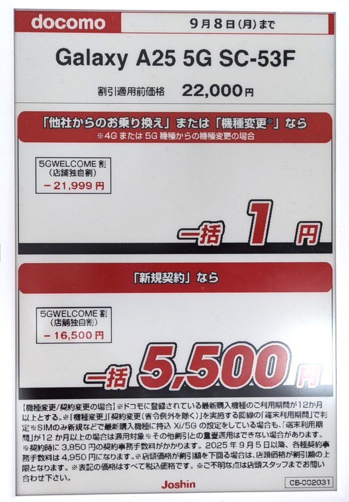 ジョーシンでは、2025年2月発売のドコモ「Galaxy A25 5G(税込22,000円)」が、機種変更一括1円となっています。
