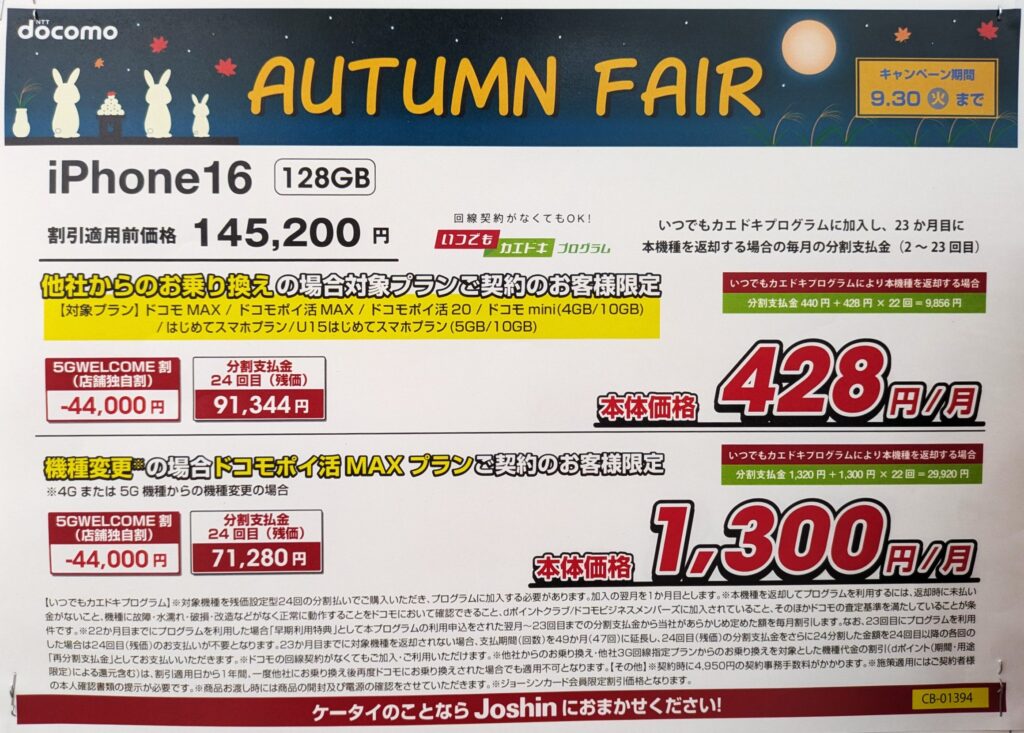 事務手数料は4,950円(税込)、9/30(火)まで。2年返却の実質負担額は49,610円(税込)です。割引上限入りましたし、少なくとも年末まではこの価格なんだと思います。