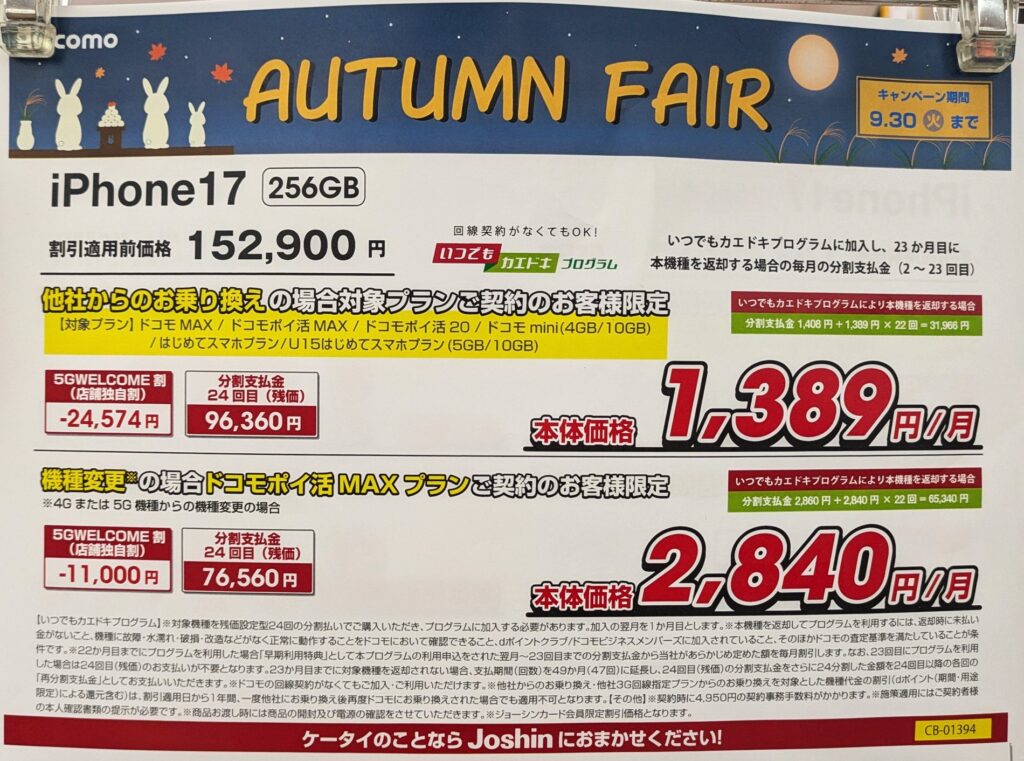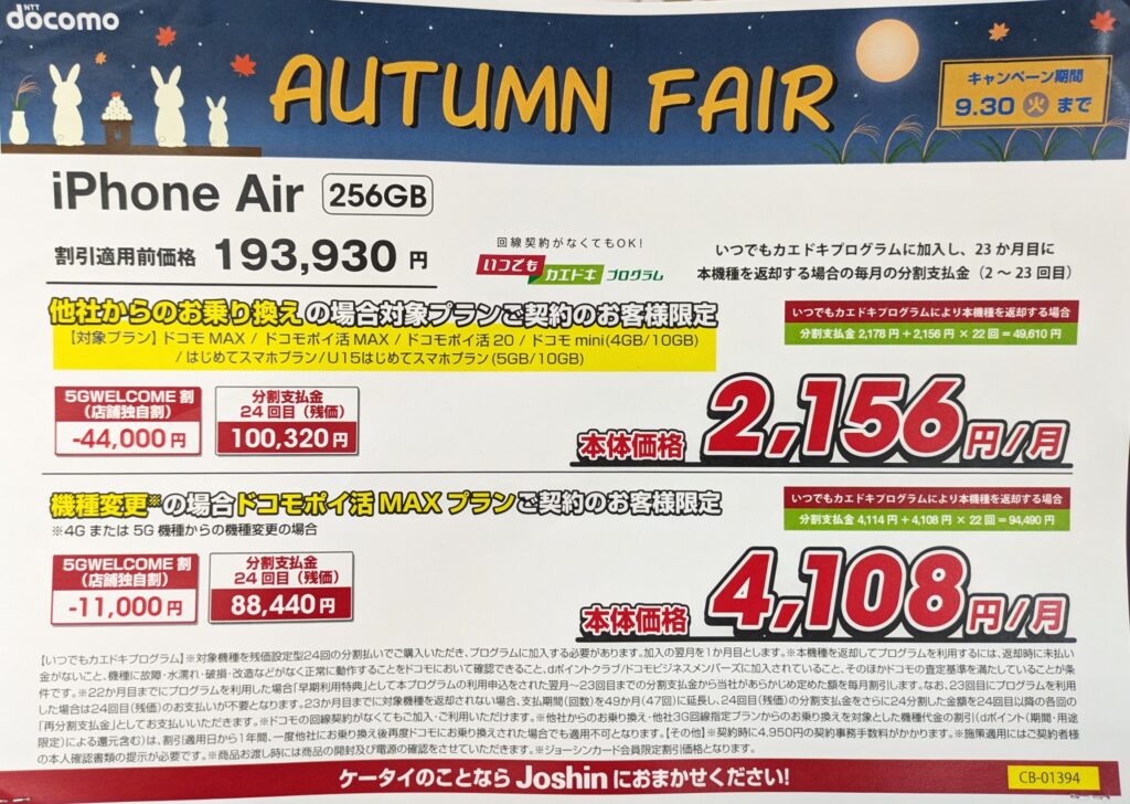 ジョーシンでは、9/19(金)に発売した「iPhone Air 256GB(税込193,930円)」が、MNPで▲44,000円割引になり、総額149,930円(税込)となっています。