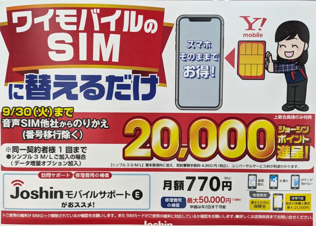 ジョーシンでは、ワイモバイルへのSIMのみMNPで20,000ポイント還元となっています。事務手数料4,950円(税込)、9/30(火)まで。15,000ポイントからの増額中です。