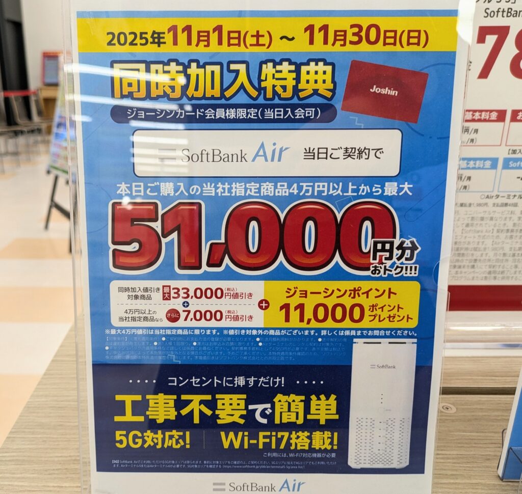 ジョーシンでは「SoftBank Air」の新規契約で家電▲40,000円割引に11,000ポイント還元となっています。11/30(日)まで。