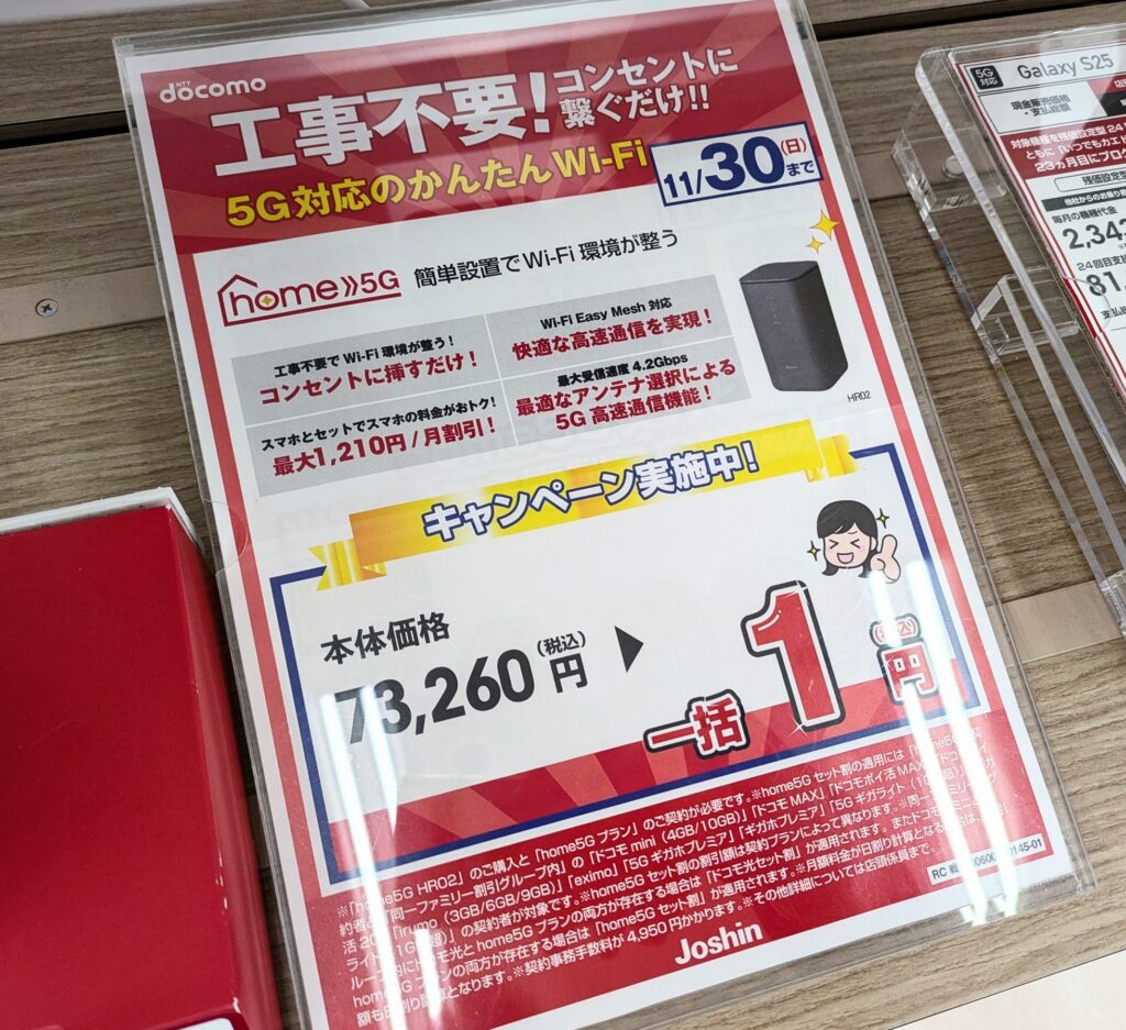 引き続き、ドコモ「home 5G HR02(税込73,260円)」が新規一括1円となっています。事務手数料は4,950円(税込)、11/30(日)まで。
