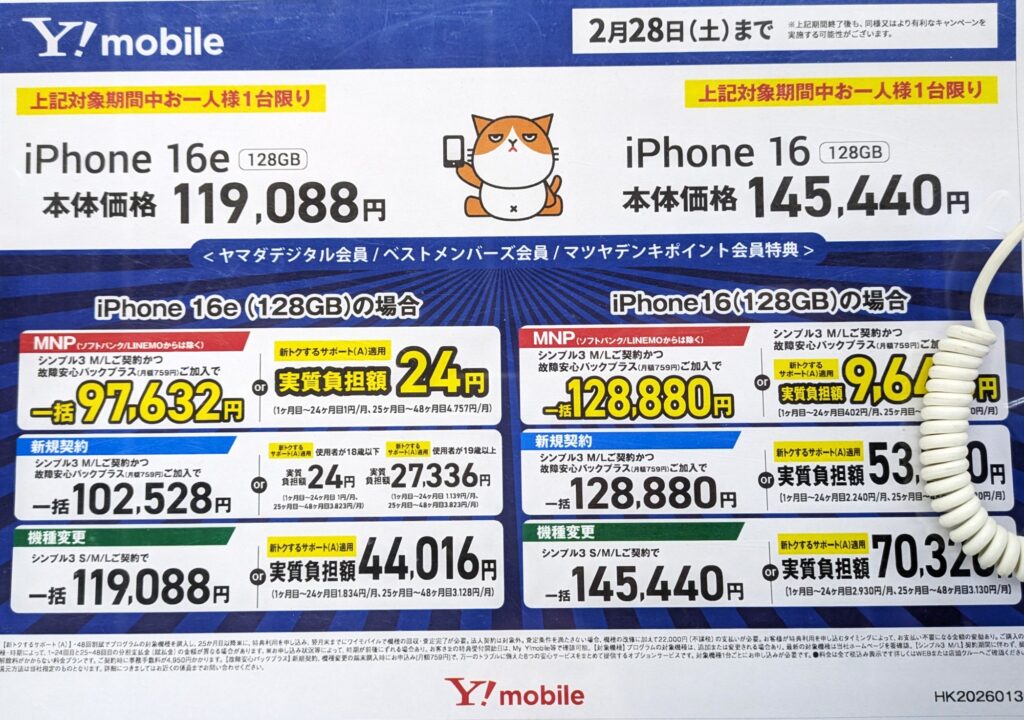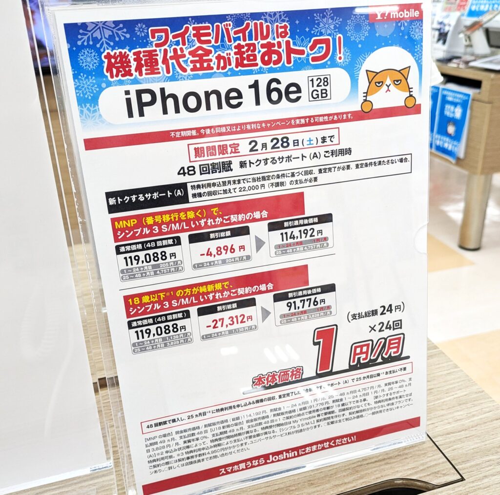 ジョーシン等の量販店では、2025年2月発売のワイモバイル「iPhone 16e(税込119,088円)」がMNPで▲4,896円割引の、総額114,192円(税込)となっています。事務手数料は4,950円(税込)、2/28(土)まで。