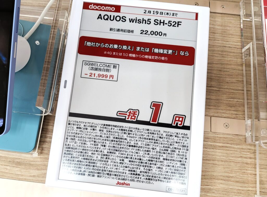 ジョーシンでは、引き続き2025年6月発売のドコモ「AQUOS wish5(税込22,000円)」が機種変更で一括1円(税込)となっています。事務手数料は4,950円(税込)、2/19(木)まで。