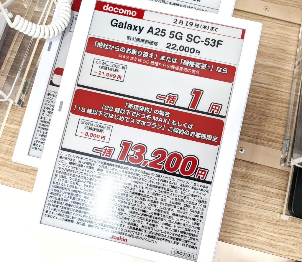 2025年2月発売の「Galaxy A25 5G(税込22,000円)」も機種変更一括1円。オープンマーケット版はまだまだ高額です。