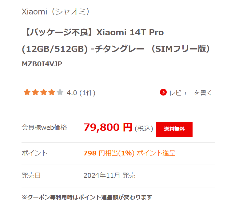 Joshin webでは、2024年11月発売の「Xiaomi 14T Pro(12GB/512GB)(パッケージ不良)」オープンマーケット版が79,800円(税込)となっています。