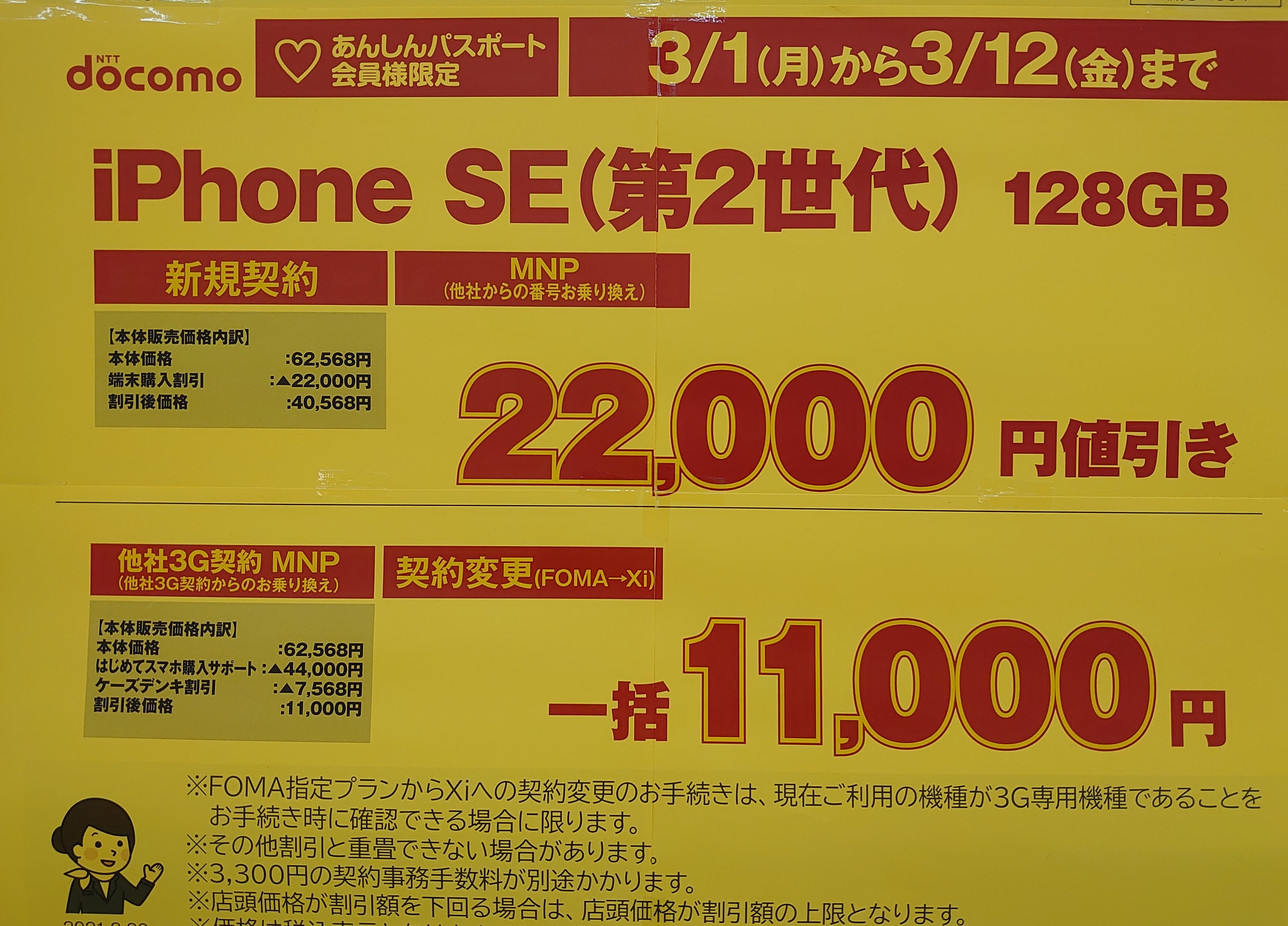 2021年2月26日からドコモはじめてスマホ購入サポートによる▲44,000円割引が入っている「iPhone SE(第2世代)128GB」ですが、ケーズデンキでは店舗独自割引▲7,568円割引とあわせて、一括11,000円(税込)となっています。