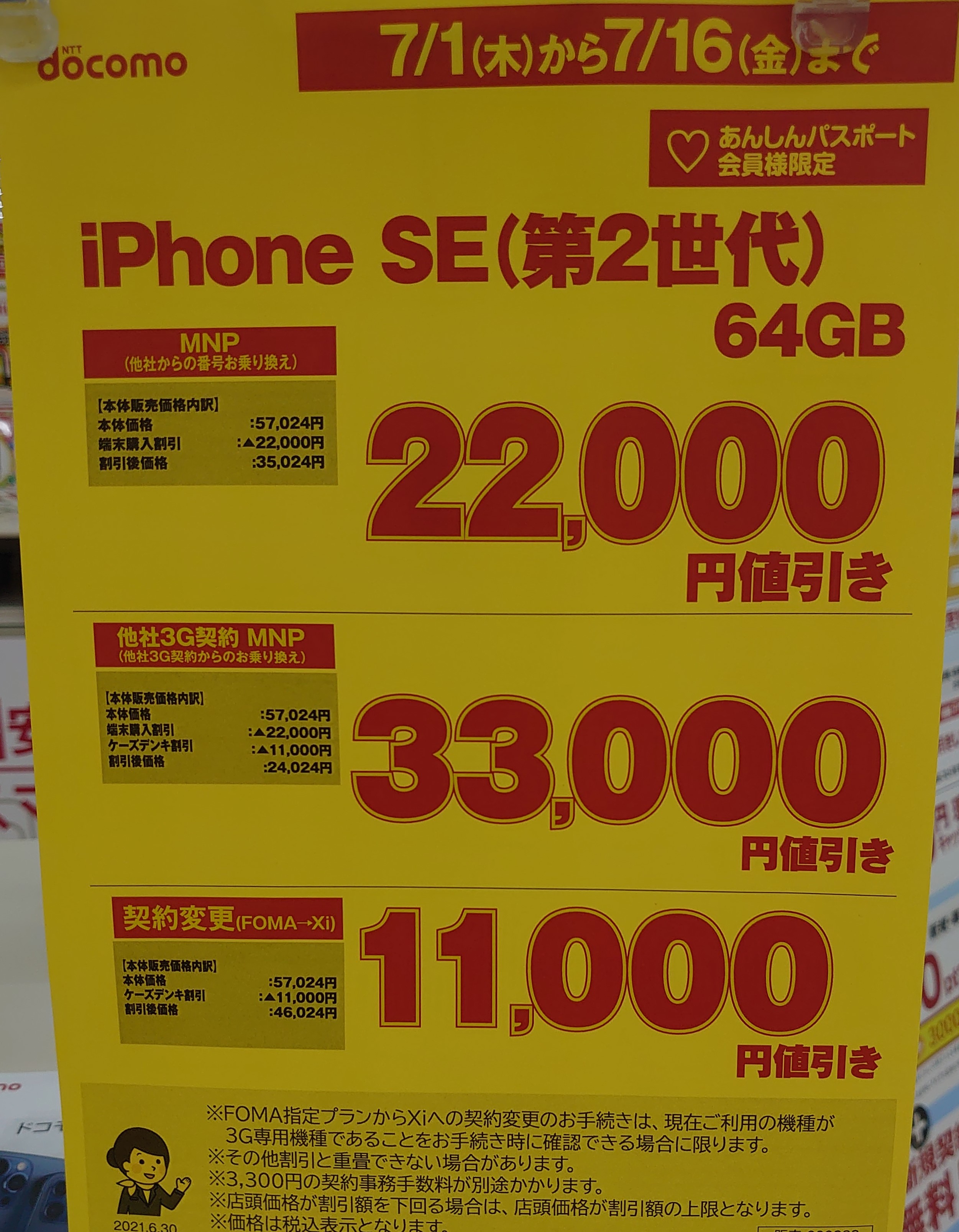 2021年7月となりました。ケーズデンキのドコモでは、iPhone SE 64GB(税込57,024円)が他社3GからのMNPで33,000円割引等となっています。