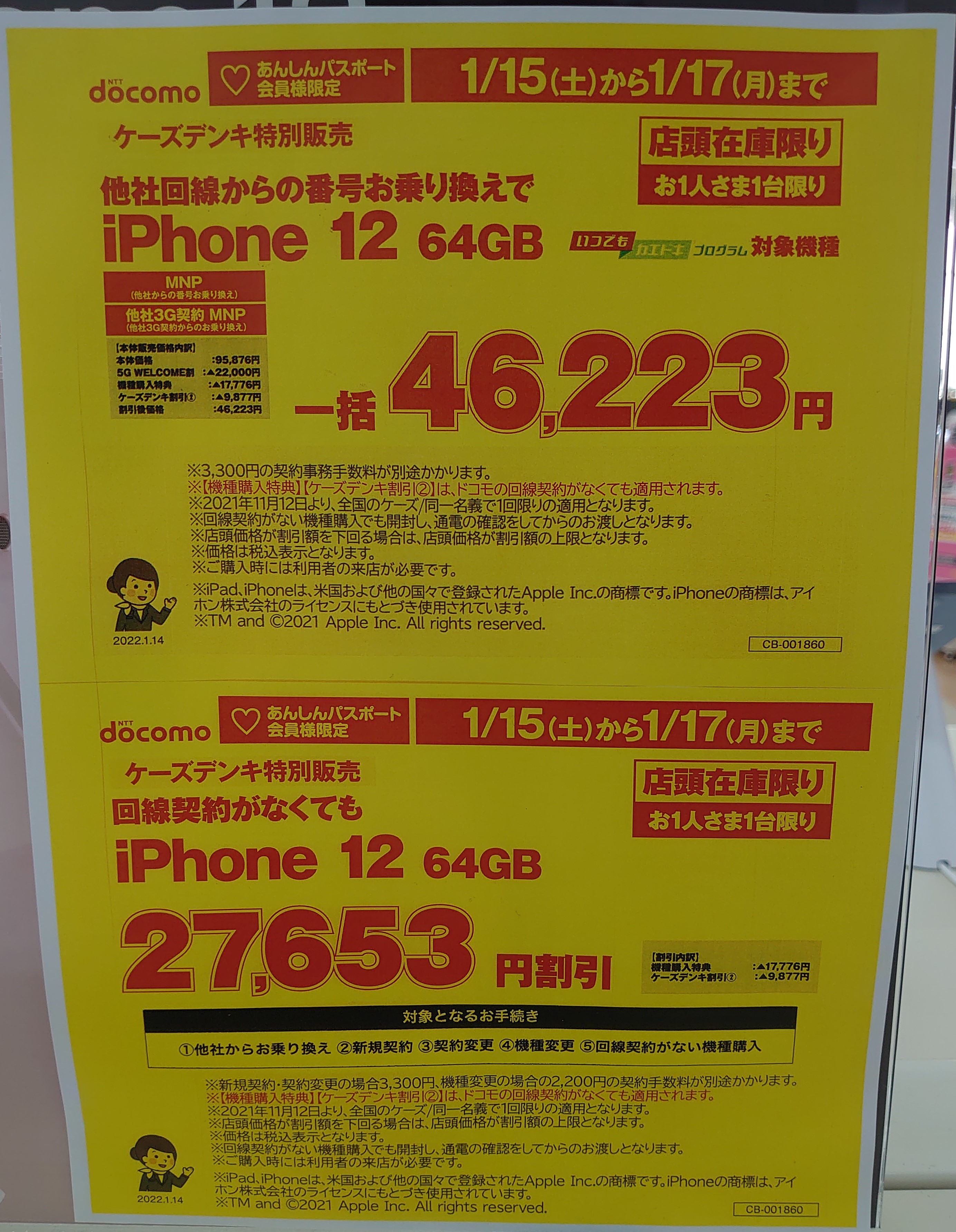 ケーズデンキのドコモでは「iPhone 12 64GB(税込95,876円)」がMNP49,653円割引で、一括46,223円となっています。事務手数料は3,300円(税込)。1/17(月)まで。