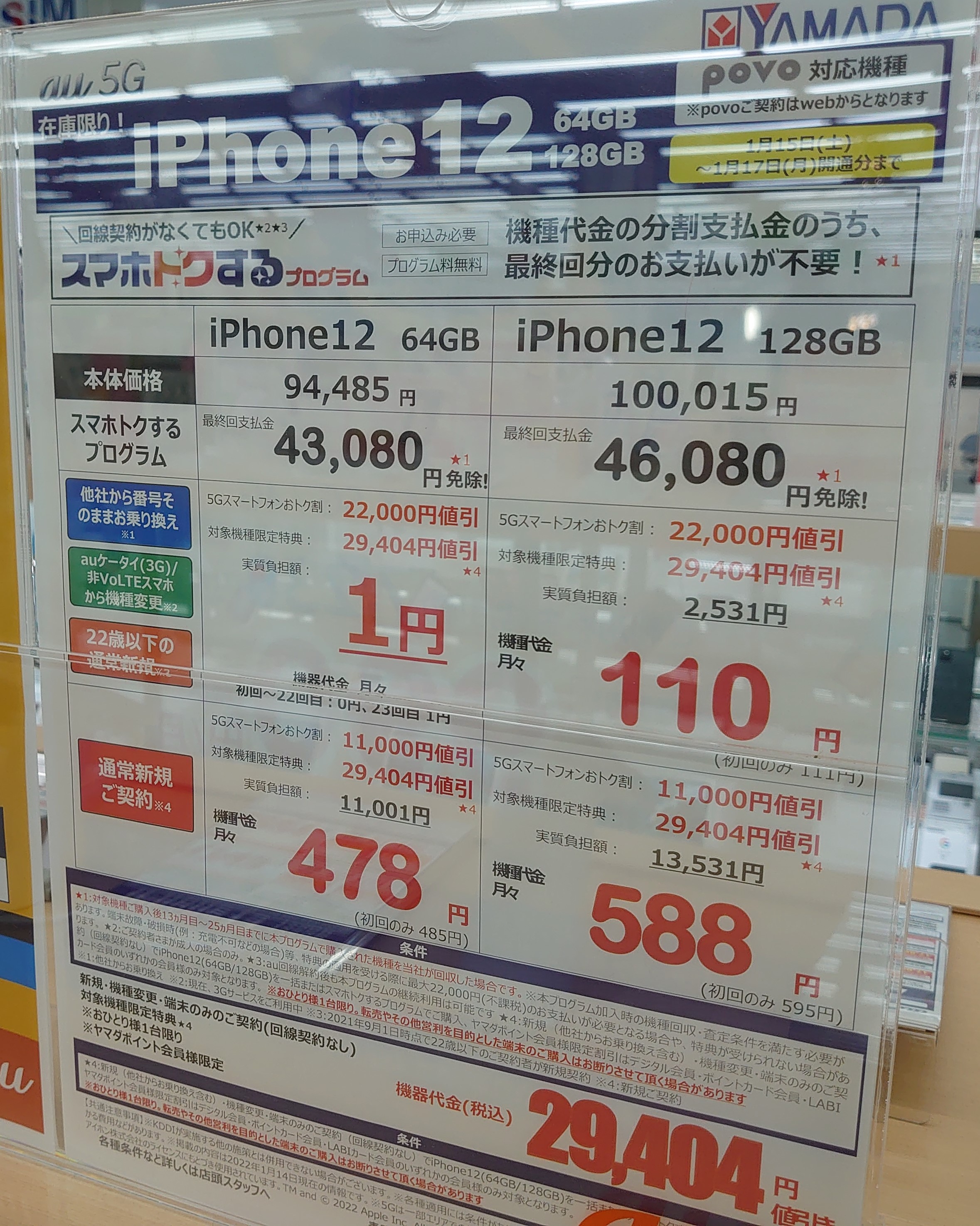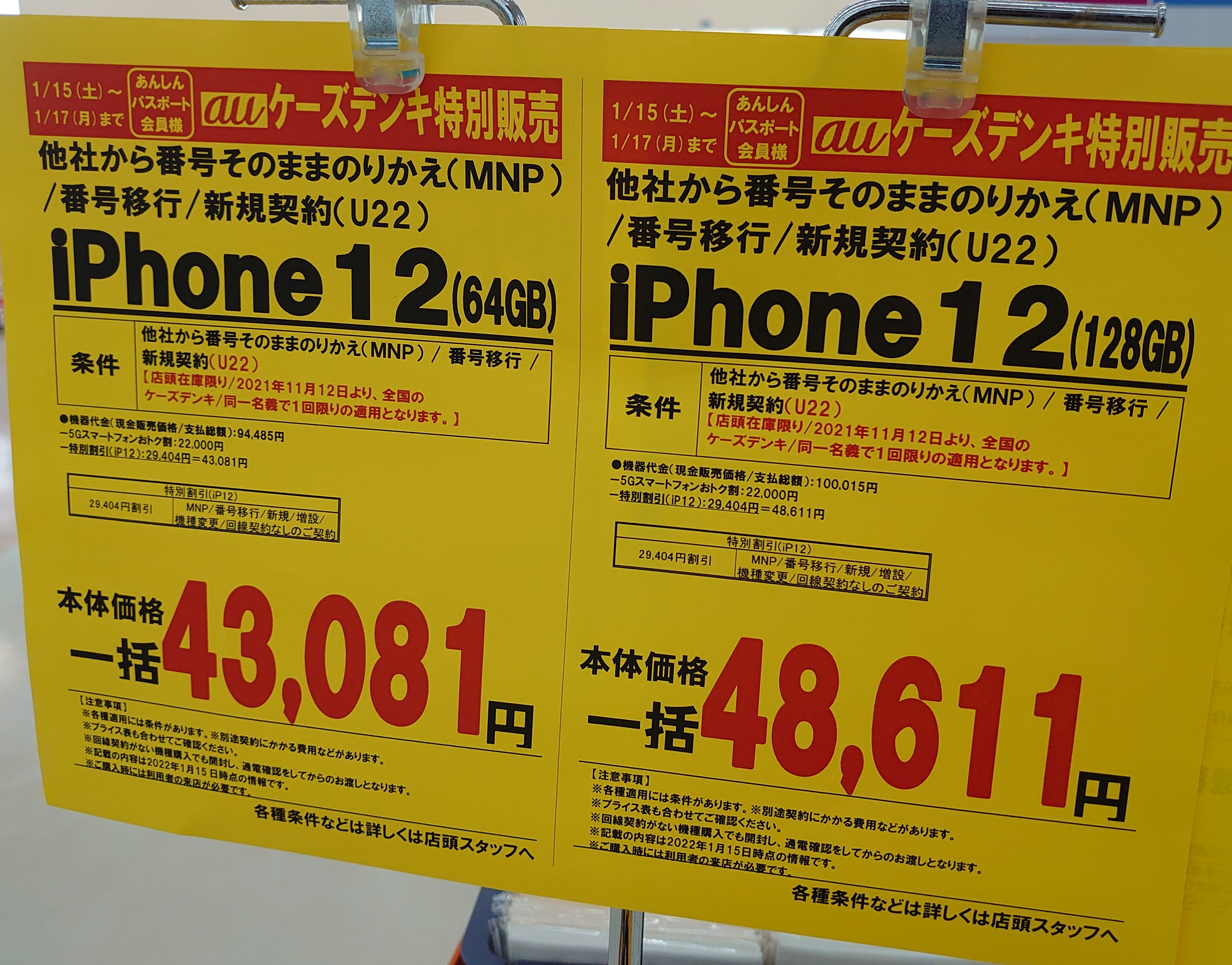auの「iPhone 12 64GB」ですが下記記事のとおりMNPほか一括57,880円(税込)としていましたが、さらに割引が入りました。このようにどんどん価格は下がりますので、特にU30の方はもう少し待った方がよろしいかと思います。