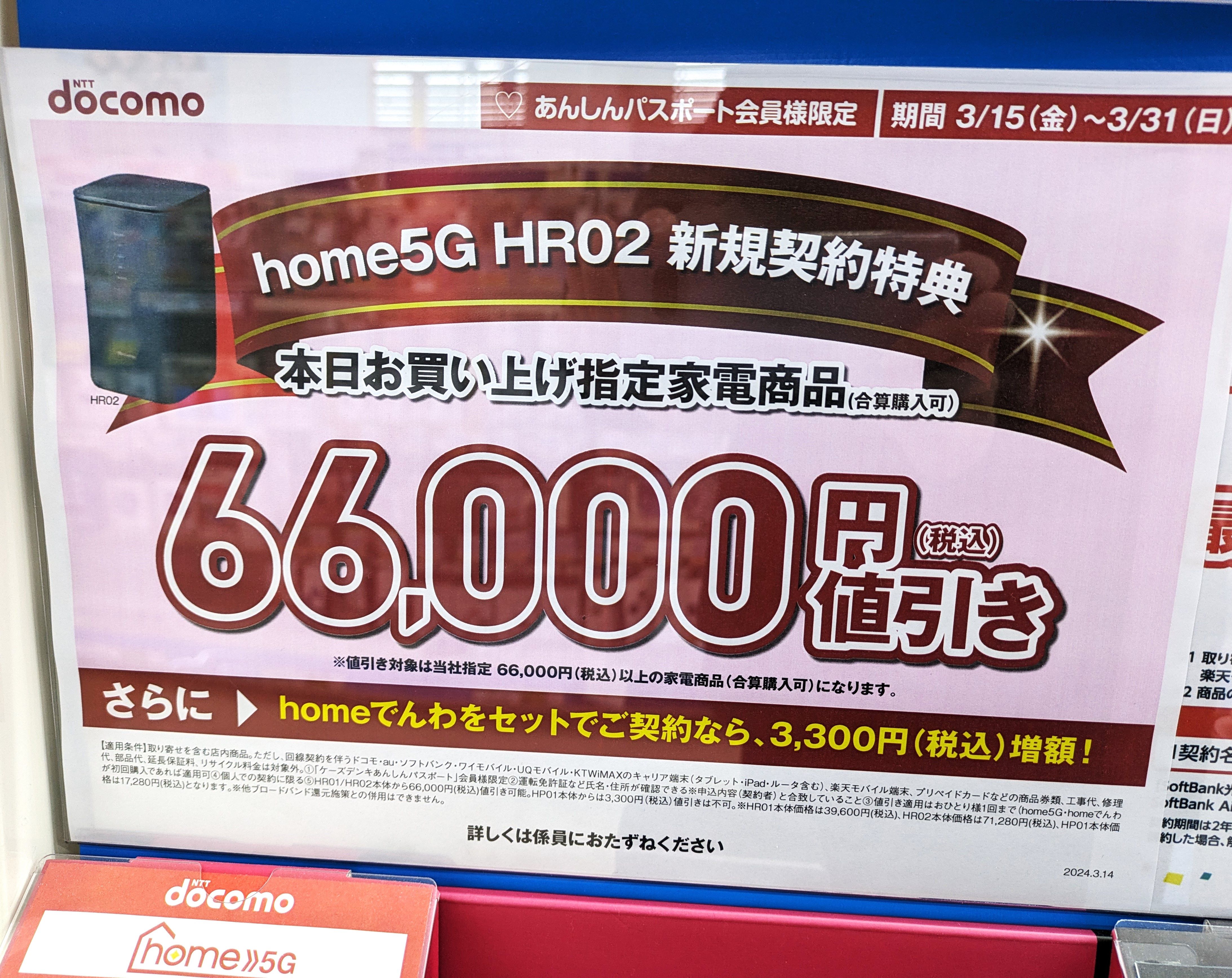 ケーズデンキでは、2023年3月発売のドコモ5Gホームルーター「home 5G HR02(税込71,280円)」が新規契約で66,000円割引となり、一括5,280円(税込)となっています。事務手数料は3,850円(税込)、3/31(日)まで。