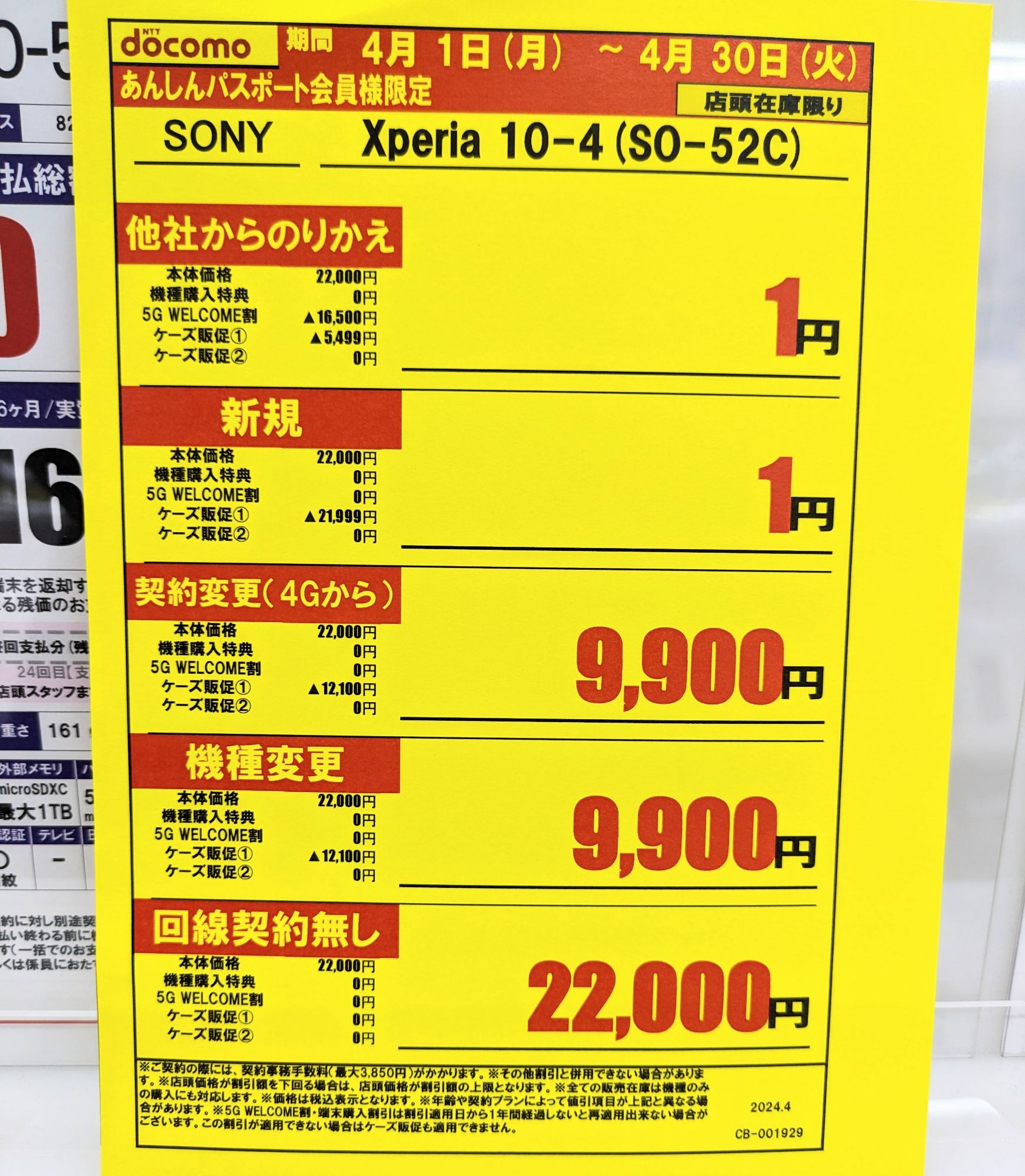 ケーズデンキでは、2022年7月発売のドコモ「Xperia 10 IV(税込22,000円)」が機種変更で一括9,900円(税込)となっています。