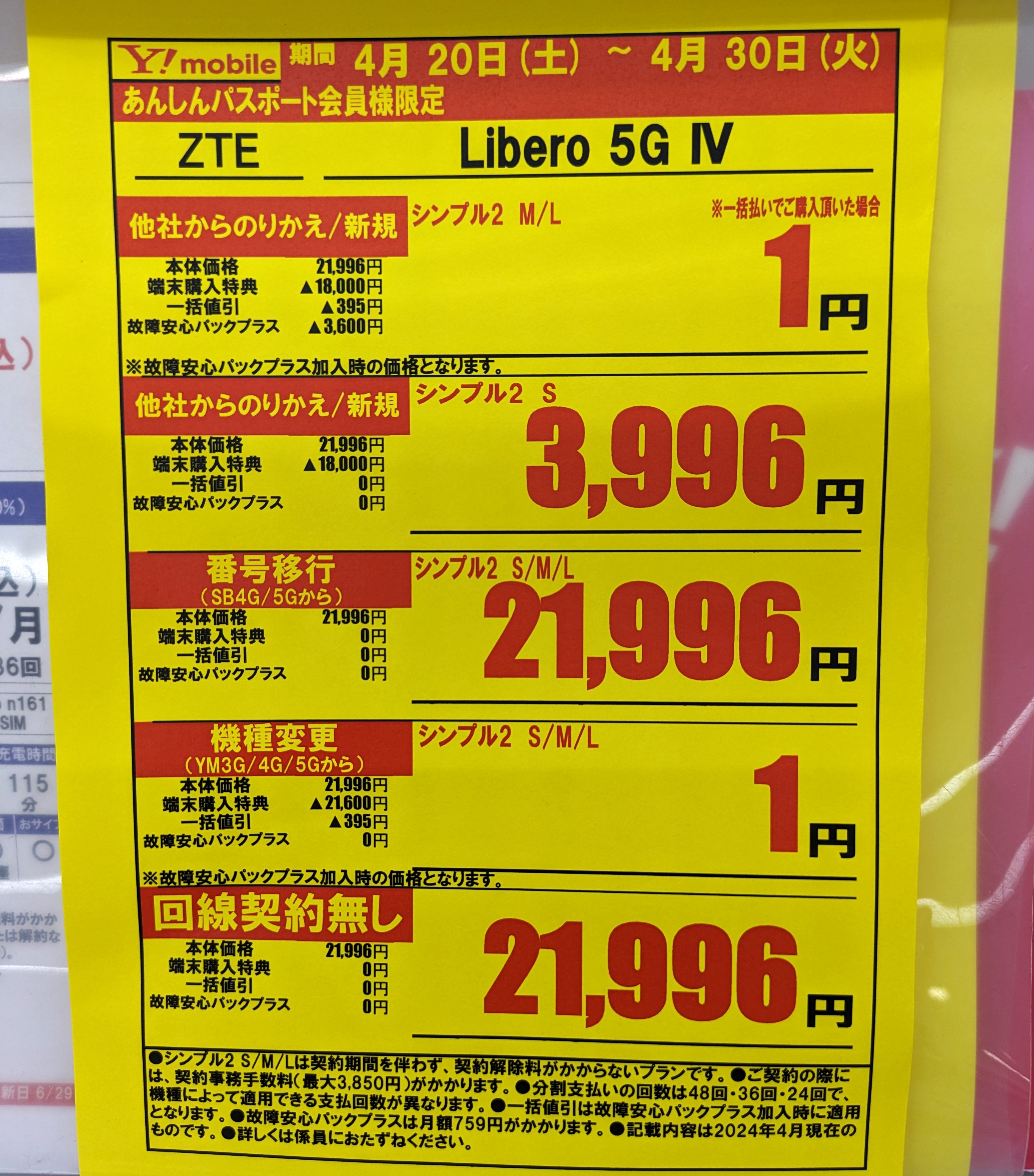 ケーズデンキでは、2023年12月7日発売のワイモバイル「Libero 5G IV(税込21,996円)」が、機種変更一括1円(税込)となっています。