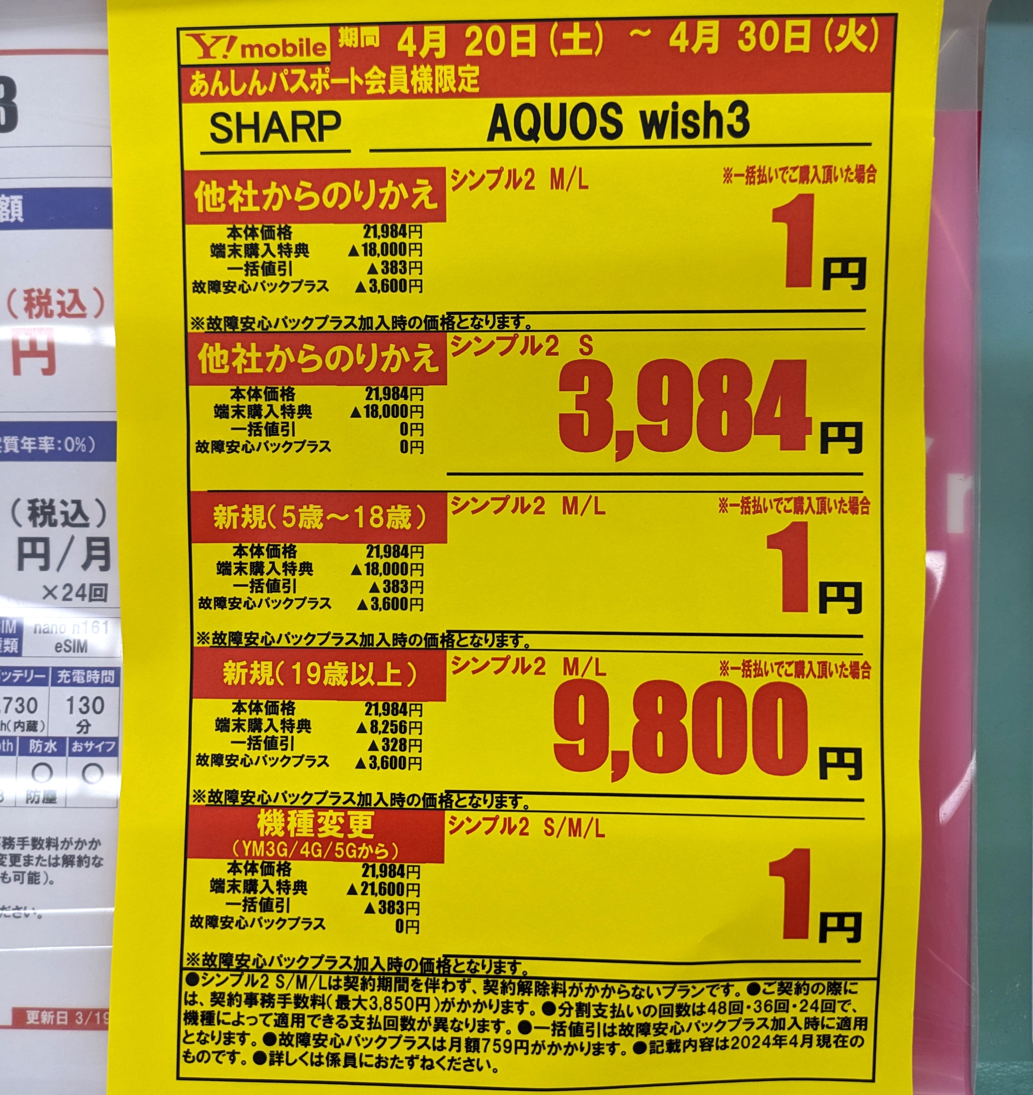 ケーズデンキでは、2023年7月発売の「AQUOS wish3(税込21,984円)」が、機種変更一括1円となっています。事務手数料は3,850円(税込)、4/30(火)まで。初月は故障安心パックプラス(月額759円)の加入が必要です。