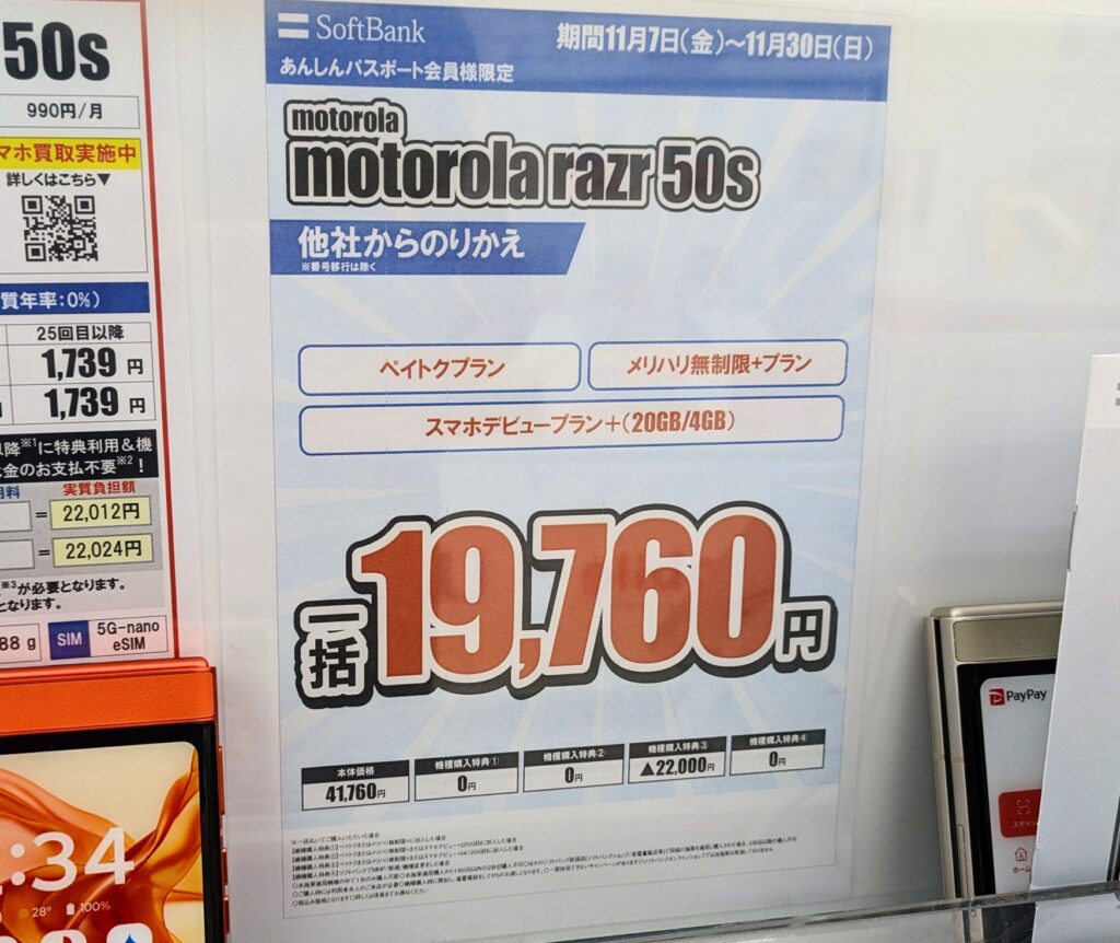 ケーズデンキ等の量販店では、2024年9月発売のソフトバンク「motorola razr 50s(税込41,760円)」が、MNP一括19,760円(税込)となっています。