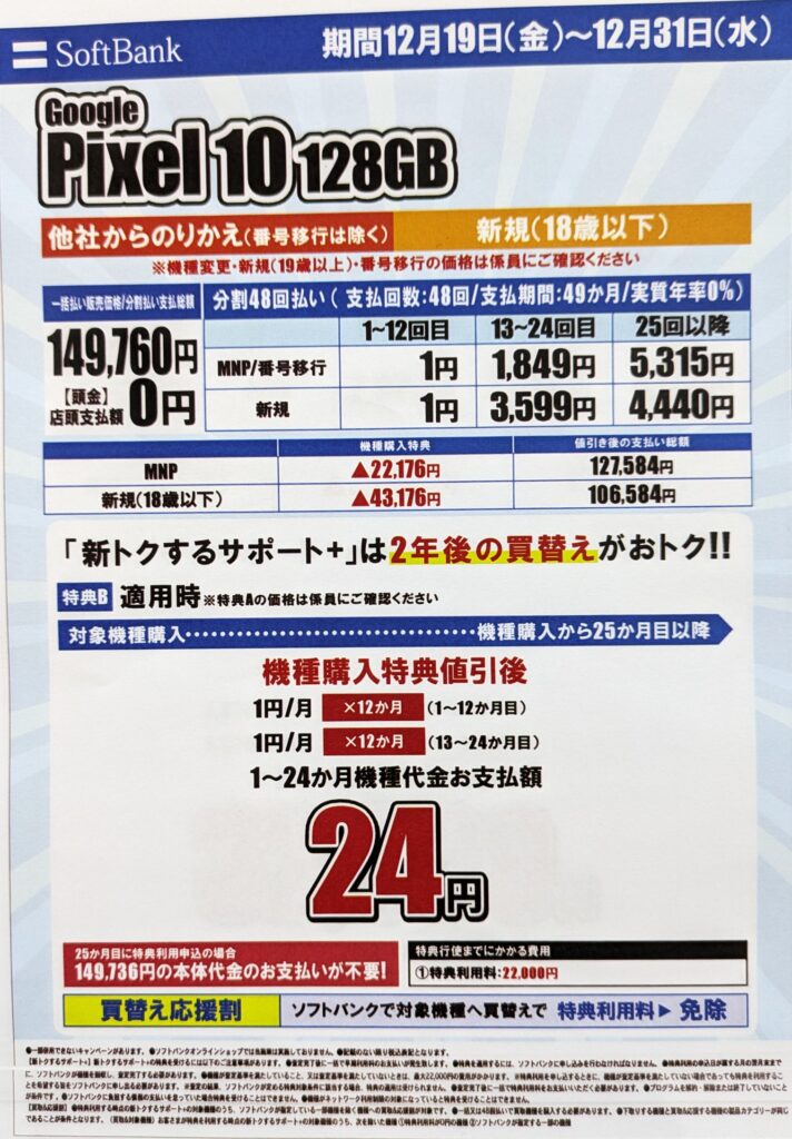 ソフトバンクオンラインショップや量販店では、2025年8月発売の「Google Pixel 10 128GB(税込149,760円)」が、MNP・U18新規の2年返却で、実質24円(税込)となっています。