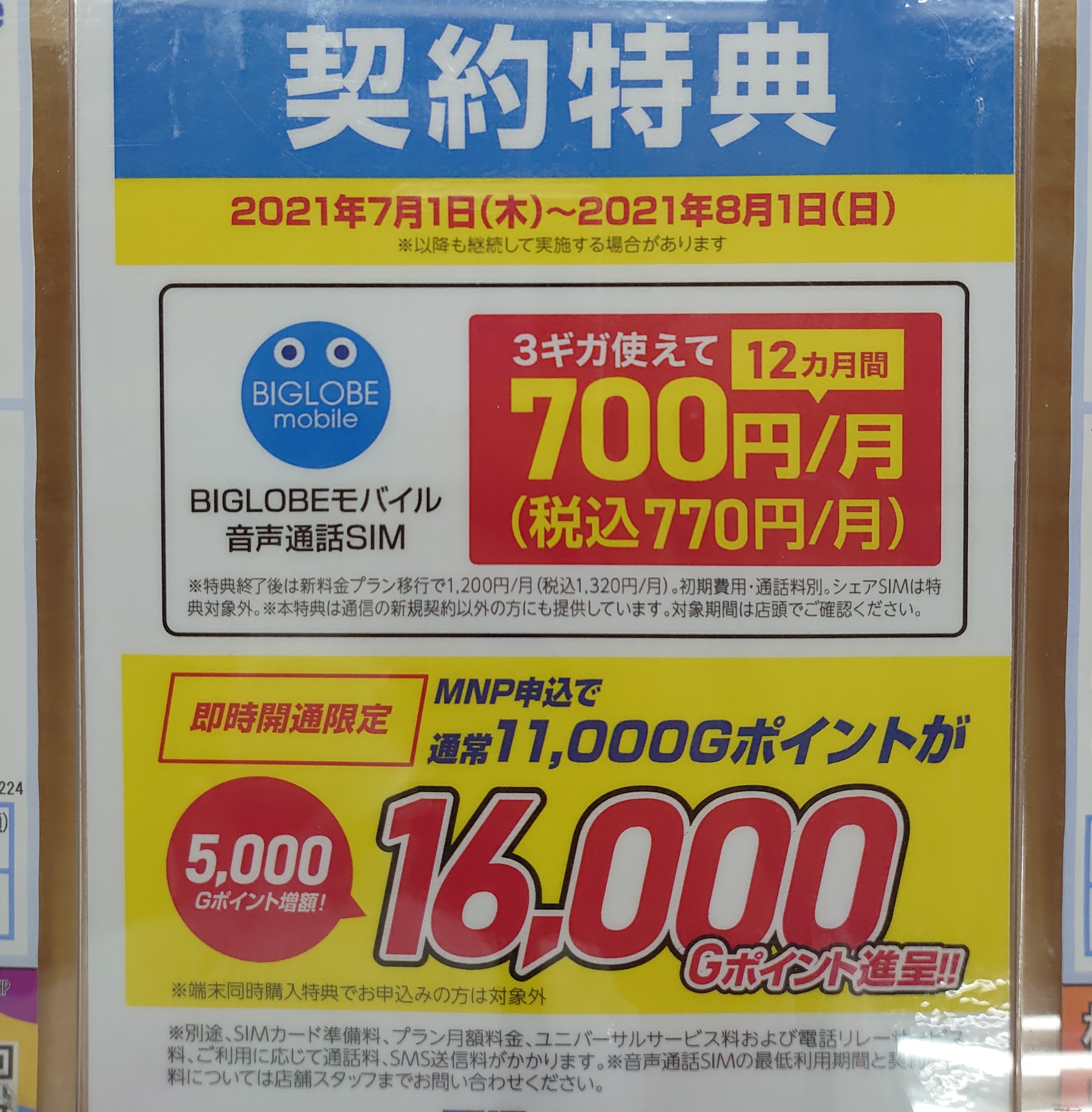 2021年7月に入り、ヤマダデンキLABI1なんば店では、ビッグローブSIMのみMNPで16,000Gポイント還元となっています。事務手数料は無料。8月1日(日)まで。11,000Gポイント還元からの増額です。