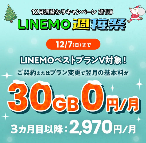 また、現在実施されているキャンペーンとしては、12月の週変わりキャンペーン第1弾として、12/7(日)までは、1か月間(開通月の翌月)、LINEMOベストプランVの月額基本料が0円です。