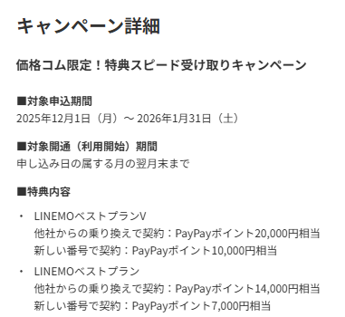 LINEMOでは、価格ドットコム経由での契約で、最大20,000円相当のPayPayポイント還元キャンペーンを実施中です。また、価格ドットコム経由で、通常7か月後上旬に付与されるPayPayポイントが、2か月後上旬に付与となります。