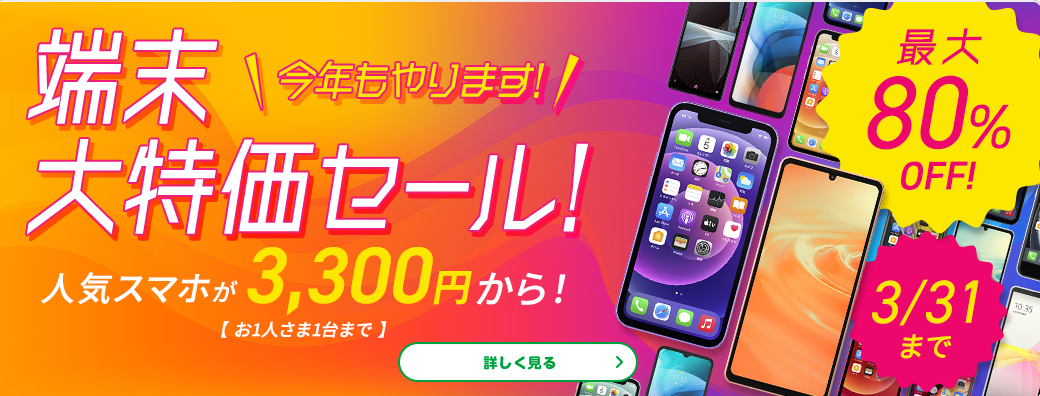 マイネオの端末大特価セールは3/31まで。「Redmi 9T」が3,300円(税込)等となっています。詳細はマイネオホームページでご確認を。乗り換え(MNP)&音声通話SIM契約必須です。