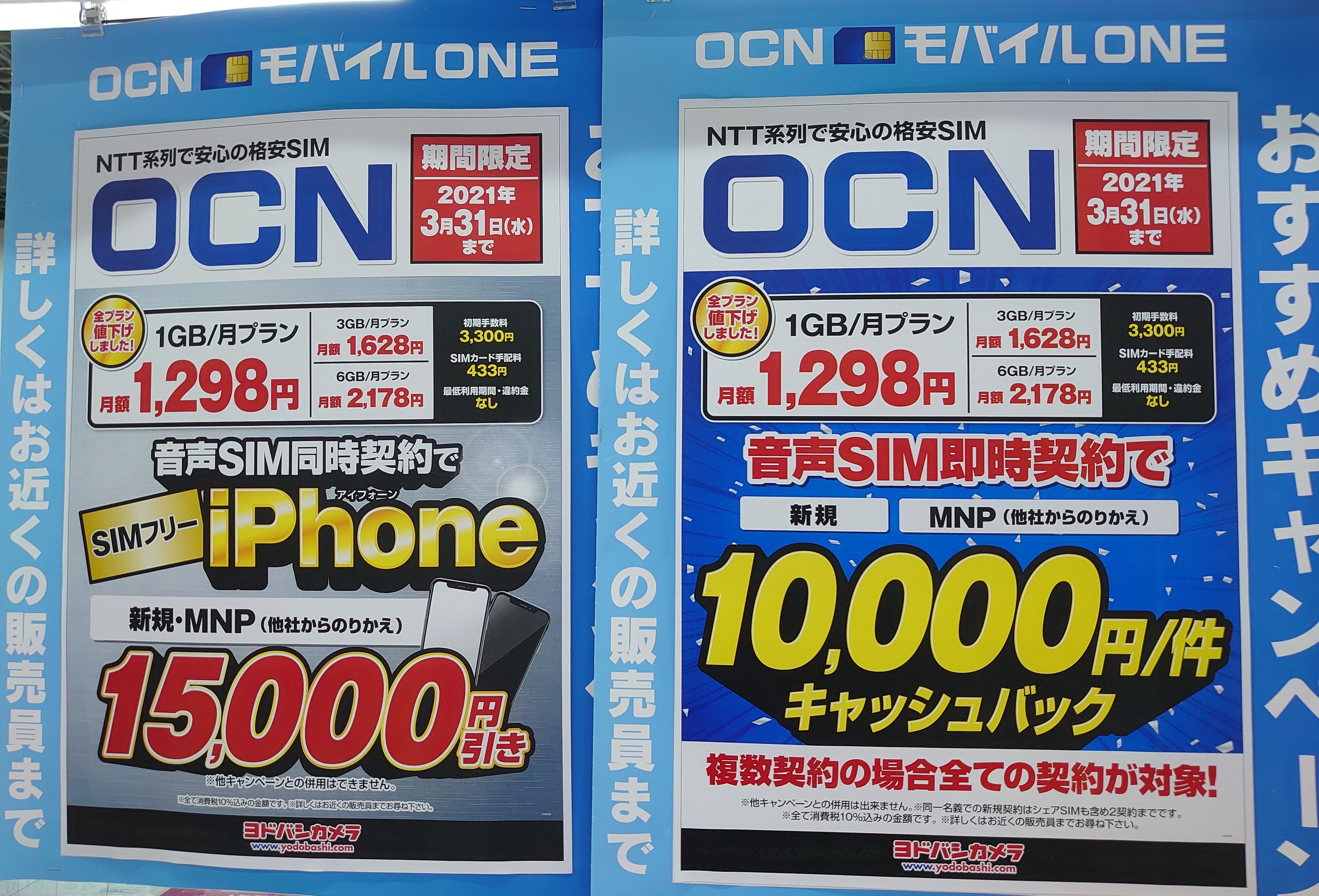 ヨドバシカメラではOCNモバイルONE契約(新規・MNP)で、SIMフリーのiPhoneが15,000円割引となっています。事務手数料は3,300円(税込)、SIMカード手配料は433円(税込)です。3月31日(水)まで。