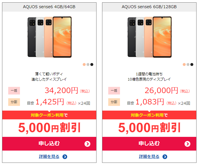 2023年5月29日(月)、OCNモバイルONEでは、2021年11月発売の「AQUOS sense6」が、機種変更クーポン利用で一括20,500円(税込)となっています。9:00時点在庫有り。