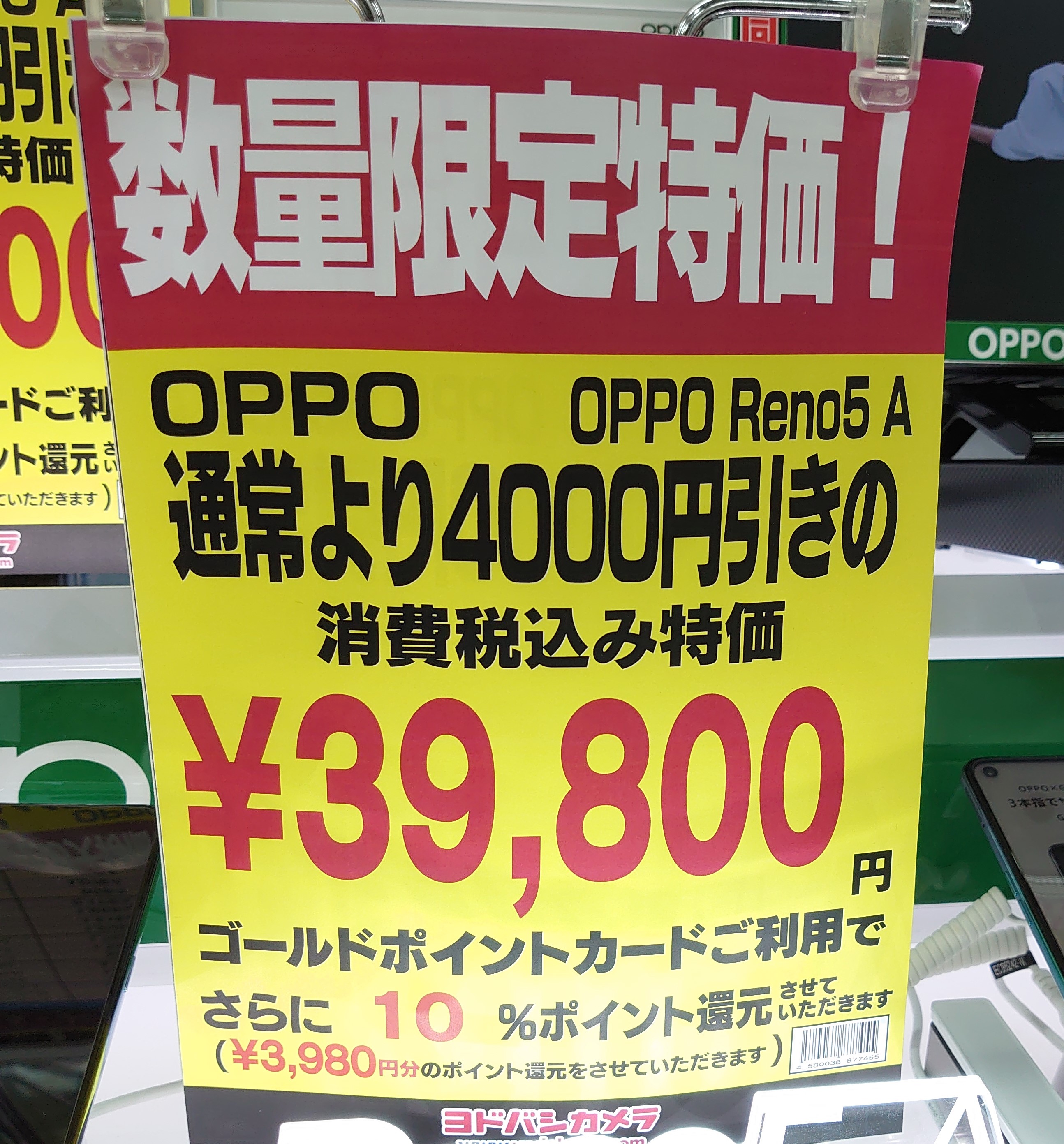 ヨドバシカメラでは「OPPO Reno5 A」が週末限定特価ということかと思いますが、39,800円(税込)になっています。さらに、3,980ポイント付与です。