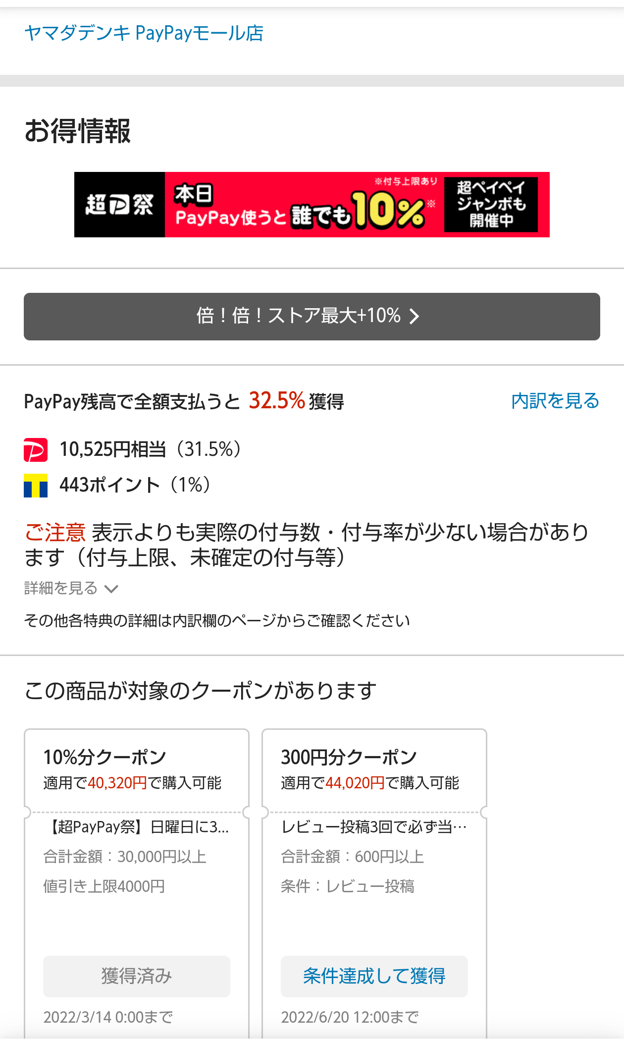 2022年3月13日(日)、3万円以上のお買い物で使用出来る「10%OFFクーポン(上限4,000円)」が配布されています。取得は以下より。