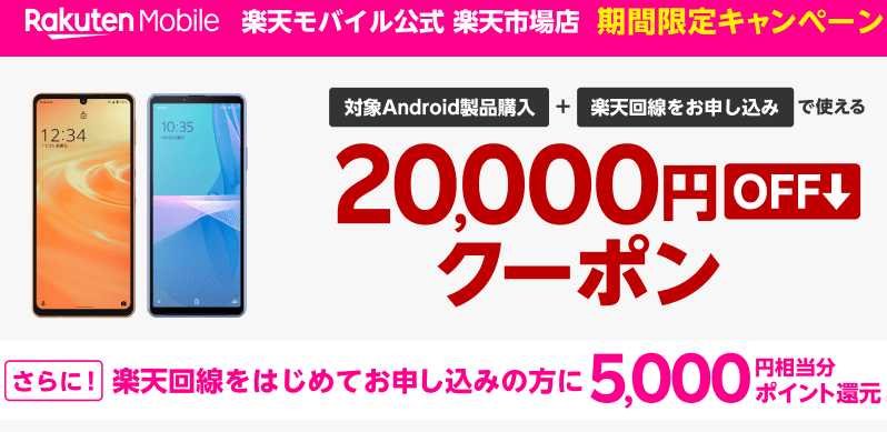 ・楽天モバイル公式 楽天市場店でandroid対象製品と楽天回線セットご注文で20,000円OFFクーポン ![]()