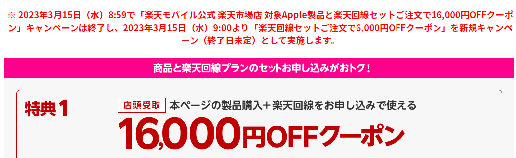 楽天モバイル公式楽天市場店の「iPhone」で使用出来る16,000円OFFクーポンは3/15(水)8:59まで。以降は6,000円OFFクーポンに切り替わります。クーポンは一人1回まで。回線契約必須。