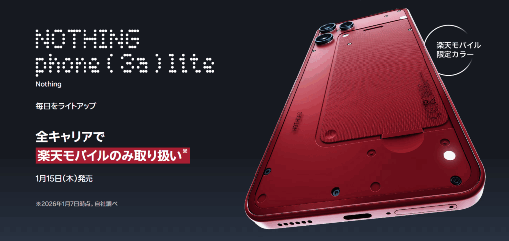 2026年1月15日(木)に、楽天モバイルから「Nothing Phone (3a) Lite」が発売されます。本体価格は32,890円(税込)。