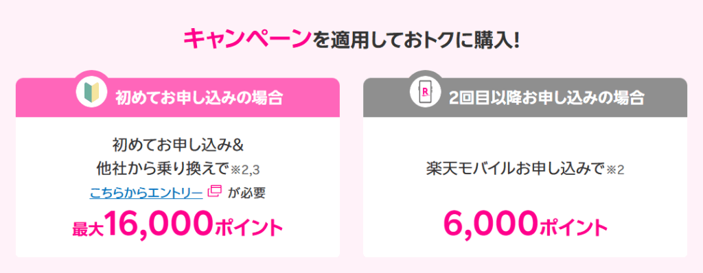 楽天モバイルを初めて契約し、かつMNPであれば合計16,000ポイント還元です。内容としては、はじめての乗り換え契約で10,000ポイント(エントリーはこちら)+ 特定端末購入6,000ポイント(エントリーは不要)で、合計16,000ポイント還元です。それぞれ下記をご確認下さい。