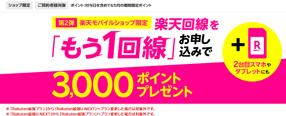 楽天モバイルでは、引き続きショップ限定で「もう1回線お申し込みで3,000ポイントキャンペーン(キャンペーンコード2331)」を実施中です。1/20(火)時点、キャンペーン終了日は未定です。一人1回限り。