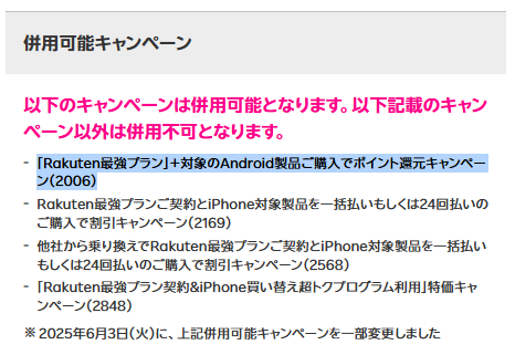 また、併用可能キャンペーンとして「Rakuten最強プラン」+対象のAndroid製品ご購入でポイント還元キャンペーン(2006)が明記されています。