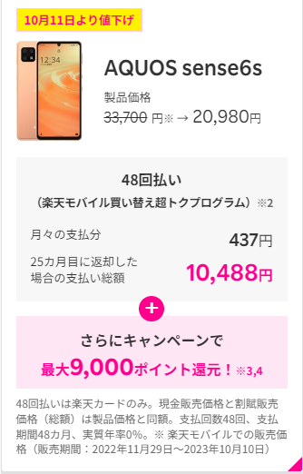 楽天モバイルでは「AQUOS sense6s」「Galaxy Z Flip4」「OPPO Reno7 A」が10/11(水)より値下げとなっています。