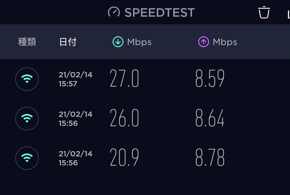 当然テザリングも可能です。親機「Galaxy A21(楽天モバイル使用)」のWi-Fiテザリングで、P30に繋げた場合の通信速度は以下のとおり。速度は場所や時間帯で大きく変わりますので参考まで。