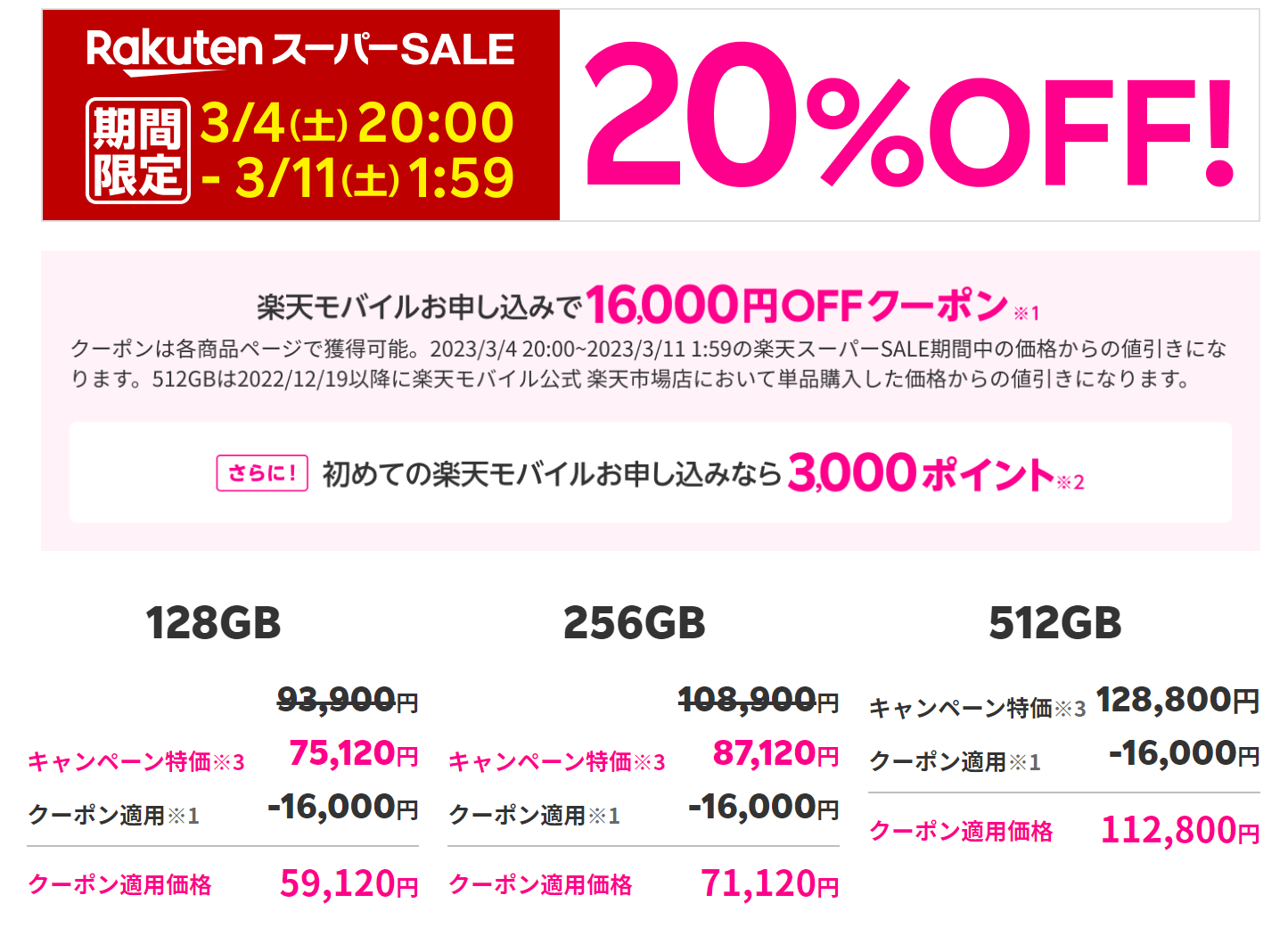 楽天モバイル公式楽天市場店の「楽天スーパーSALE iPhone最大30%値引きキャンペーン」は、3/4(土)20:00~3/11(土)1:59まで。