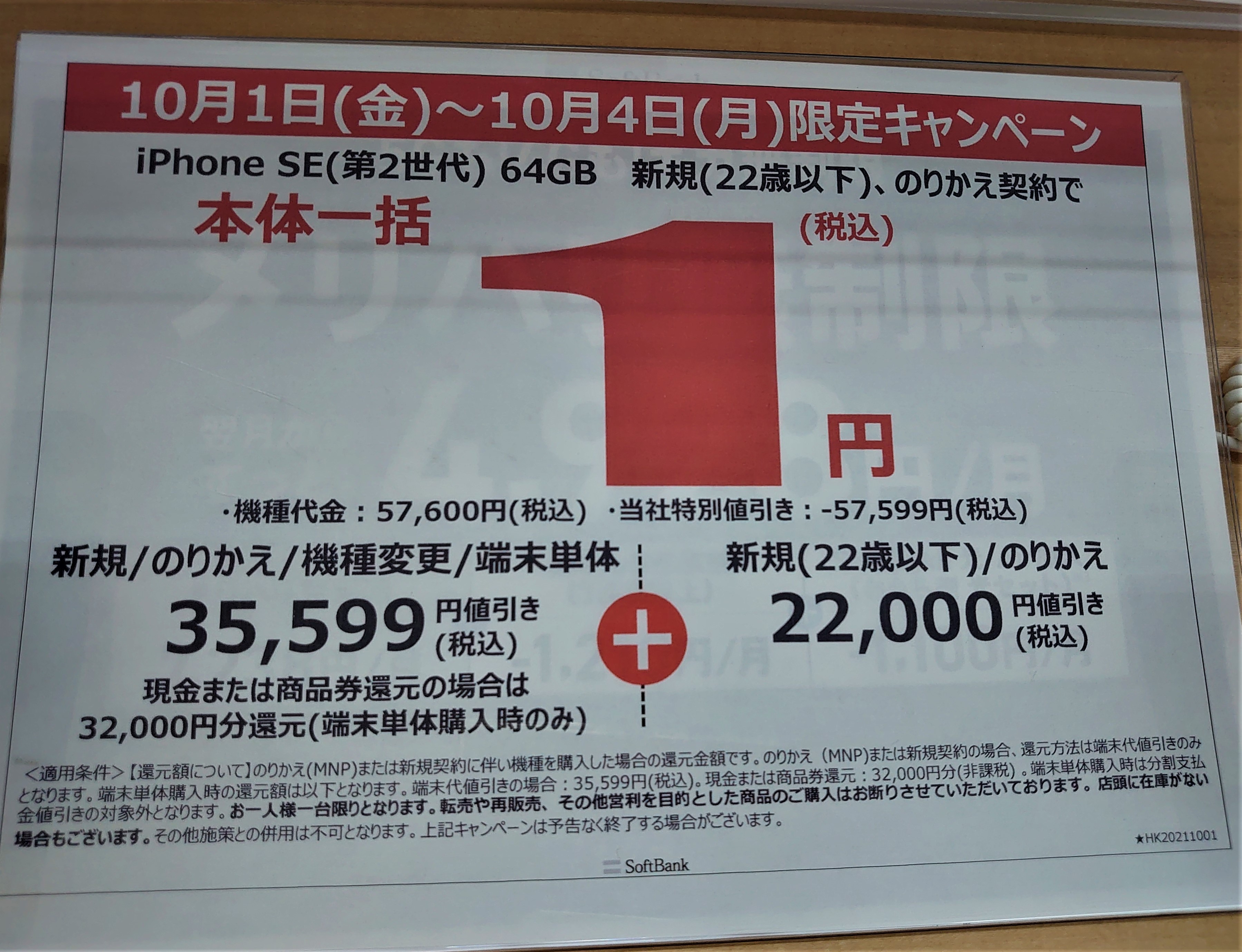 10月もソフトバンクiPhone SE(第2世代)64GBが、端末のみ購入・機種変更で22,001円(税込)、MNP一括1円、等となっています。