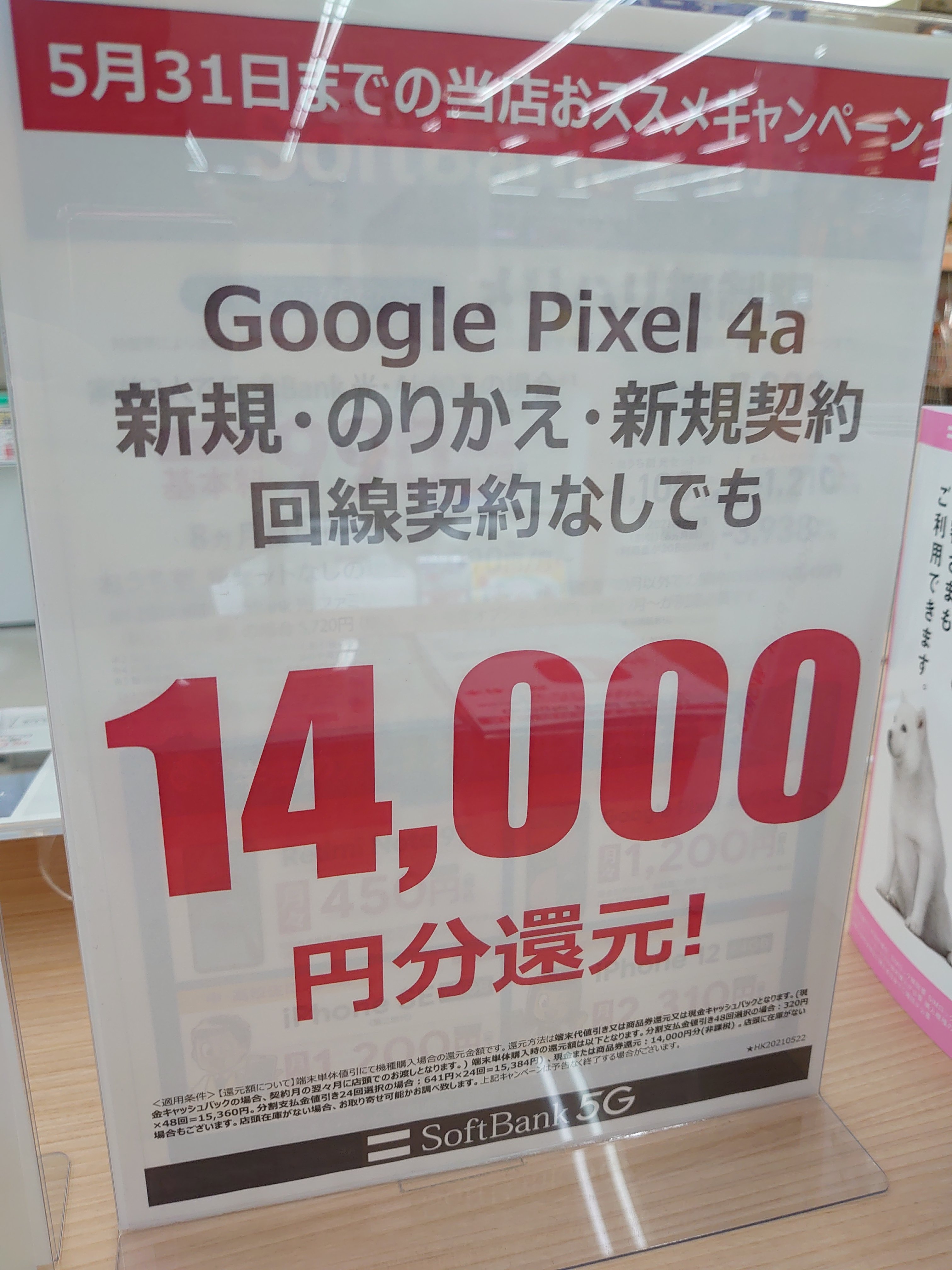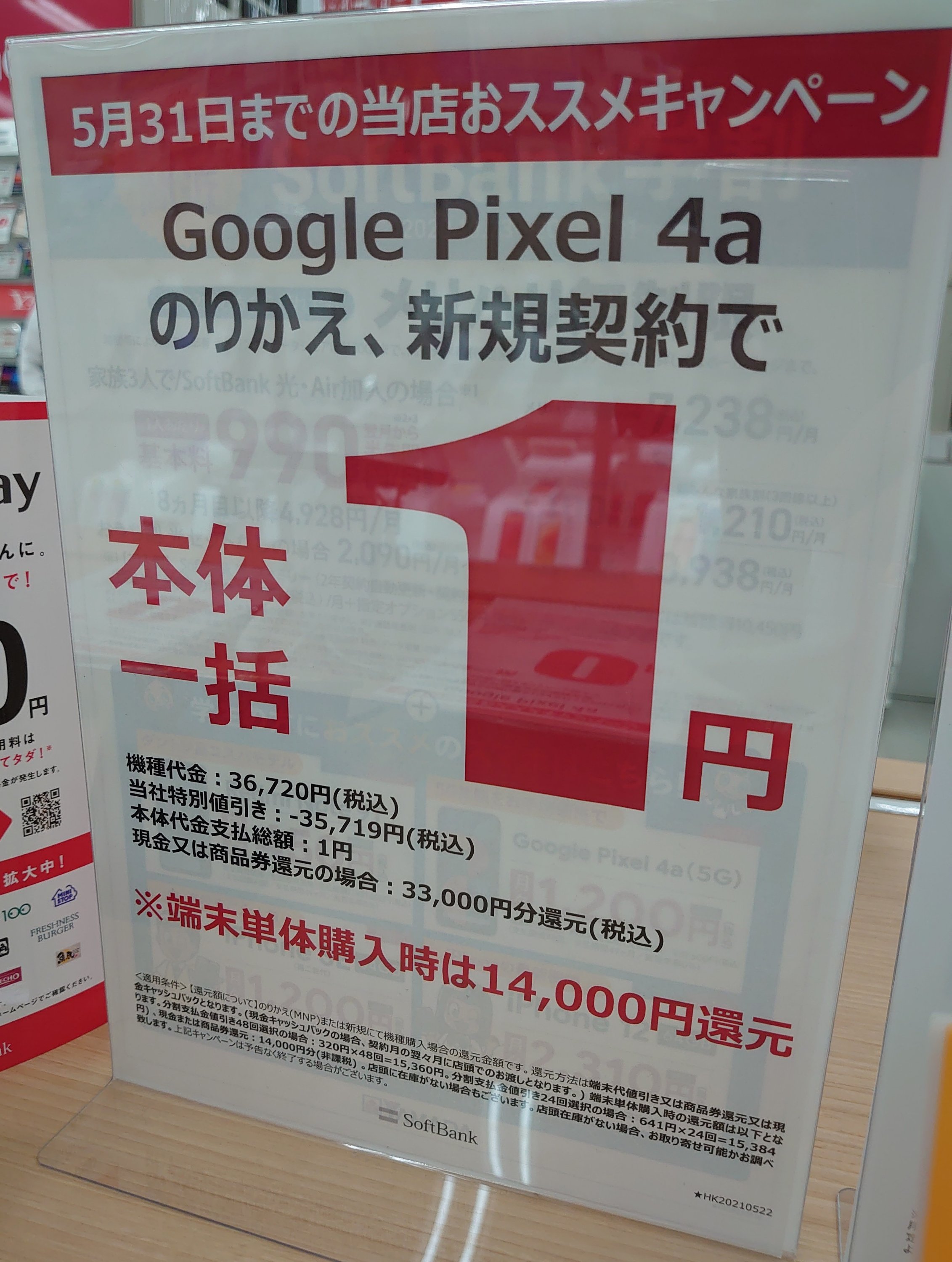 ヤマダ電機のソフトバンクでは、Google Pixel 4a(税込36,720円)が、回線契約なしの端末のみ購入でも14,000円割引で、22,720円(税込)です。5月31日まで。
