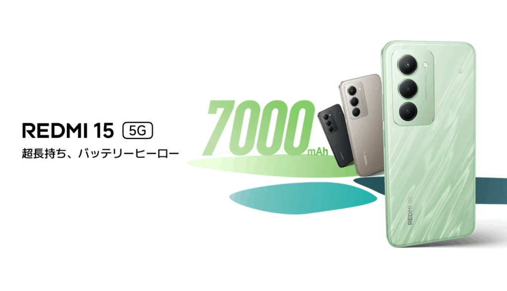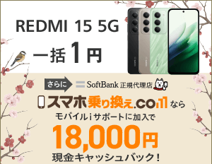 「スマホ乗り換え.com」では、2025年12月発売のXiaomi「REDMI 15 5G(税込21,984円)」が、MNP(ワイモバイルからの乗り換えは対象外)とU18新規で、一括1円+18,000円キャッシュバックとなっています。