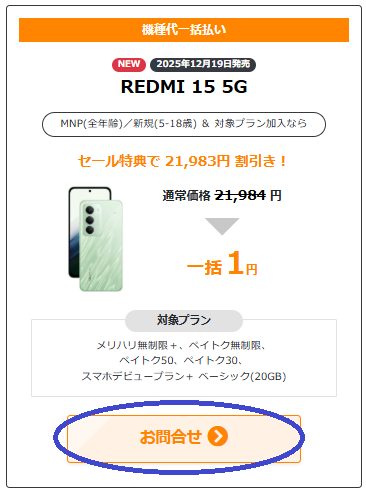 「スマホ乗り換え.com」では、2025年12月発売のXiaomi「REDMI 15 5G(税込21,984円)」が、MNP(ワイモバイルからの乗り換えは対象外)とU18新規で、一括1円+18,000円キャッシュバックとなっています。
