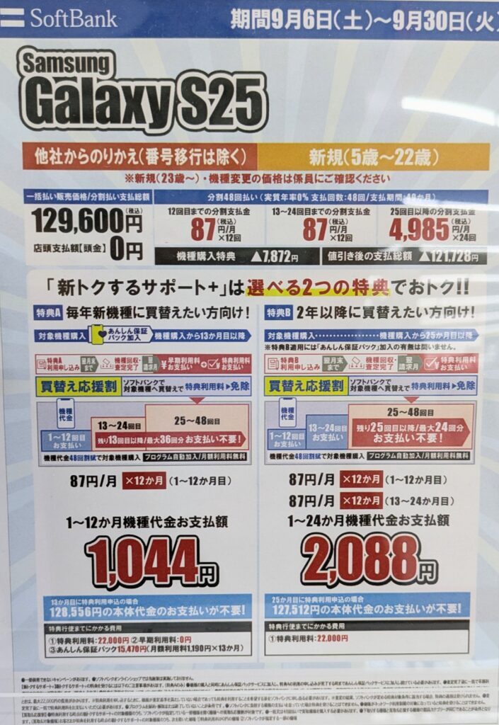 ソフトバンクオンラインショップでは、「Galaxy S25(税込129,600円)」が、MNPで▲9,936円割引になり、総額119,664円(税込)となっています。事務手数料は3,850円(税込)。「スマホデビュープラン+」がよろしいのかと思います。