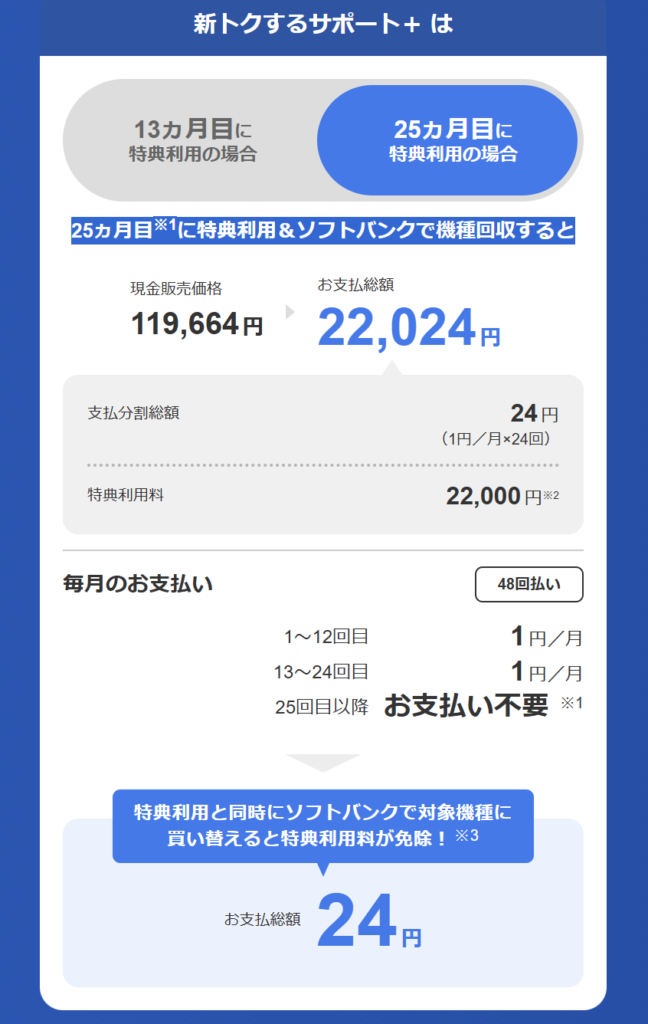 そして、新トクするサポート+で25ヵ月目に特典利用&ソフトバンクで機種回収(返却)すると▲119,640円が免除になり、結果的な支払総額は24円(税込)です。