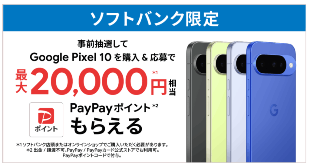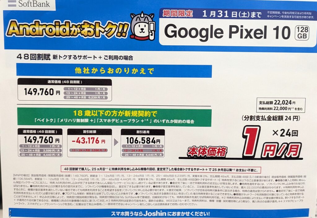 ソフトバンクオンラインショップや量販店では、2025年8月発売の「Google Pixel 10 128GB(税込149,760円)」が、18歳以下の純新規で▲43,176円割引になり、総額106,584円(税込)となっています。